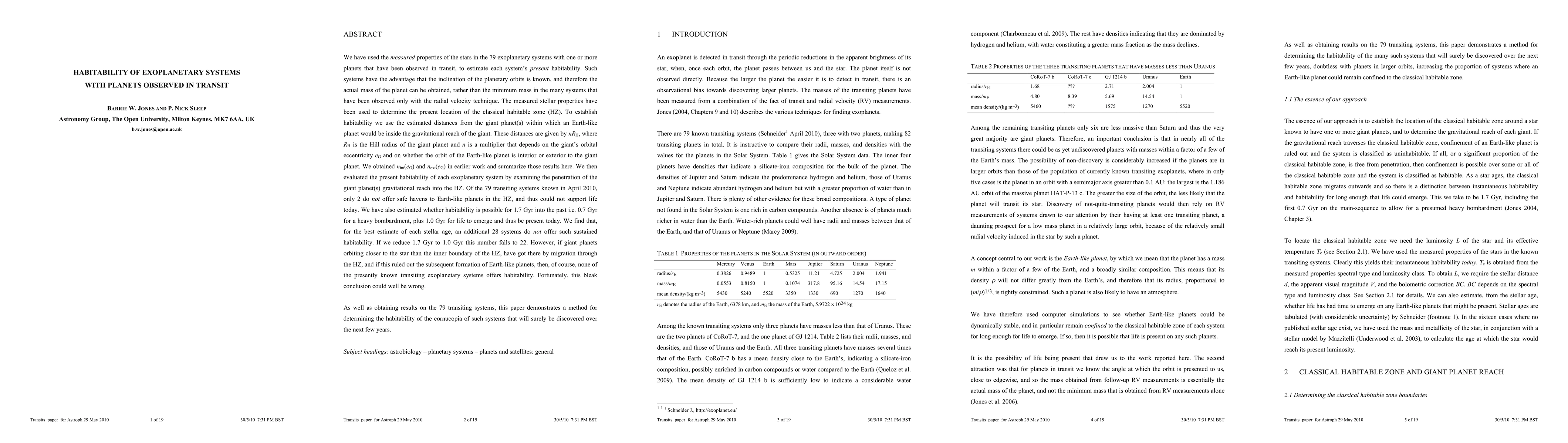 (Shortened) We have used the measured properties of the stars in the 79 exoplanetary systems with one or more planets that have been observed in transit, to estimate each system's present habitability. The measured stellar properties have been used to determine the present location of the classical habitable zone (HZ). To establish habitability we use the estimated distances from the giant planet(s) within which an Earth-like planet would be inside the gravitational reach of the giant. Of the 79 transiting systems known in April 2010, only 2 do not offer safe havens to Earth-like planets in the HZ, and thus could not support life today. We have also estimated whether habitability is possible for 1.7 Gyr into the past i.e. 0.7 Gyr for a heavy bombardment, plus 1.0 Gyr for life to emerge and thus be present today. We find that, for the best estimate of each stellar age, an additional 28 systems do not offer such sustained habitability. If we reduce 1.7 Gyr to 1.0 Gyr this number falls to 22. However, if giant planets orbiting closer to the star than the inner boundary of the HZ, have got there by migration through the HZ, and if this ruled out the subsequent formation of Earth-like planets, then, of course, none of the presently known transiting exoplanetary systems offers habitability. Fortunately, this bleak conclusion could well be wrong. As well as obtaining results on the 79 transiting systems, this paper demonstrates a method for determining the habitability of the cornucopia of such systems that will surely be discovered over the next few years.