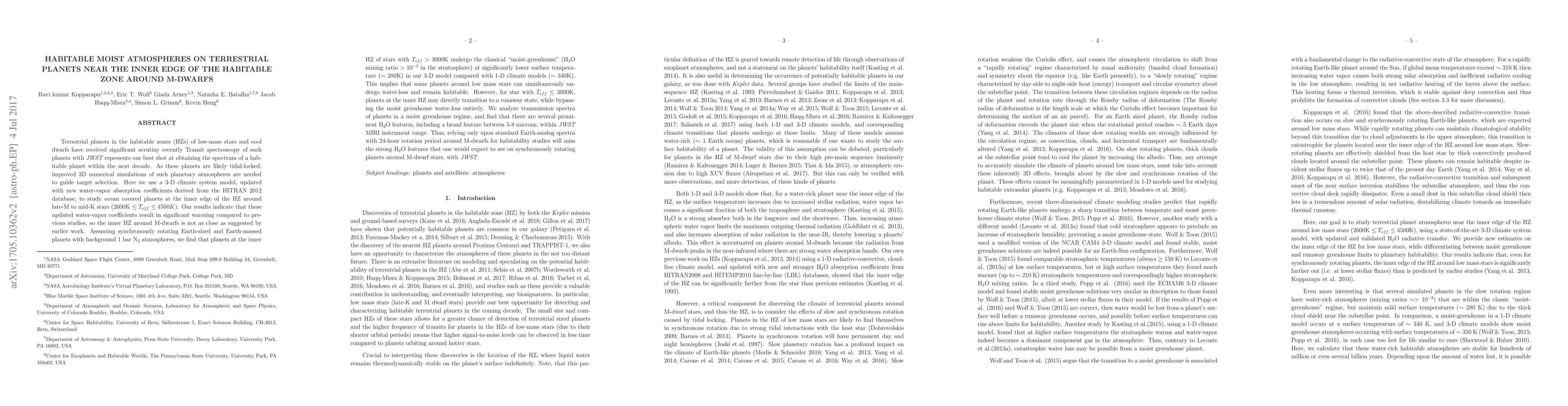 This paper explores habitable moist atmospheres on terrestrial planets near the inner edge of the habitable zone around M-dwarfs using 3-D climate models. It finds that updated water-vapor coefficients lead to significant warming, suggesting the inner HZ is not as close as previously thought, and that planets around stars with higher effective temperatures may maintain habitability through a moist-greenhouse effect.