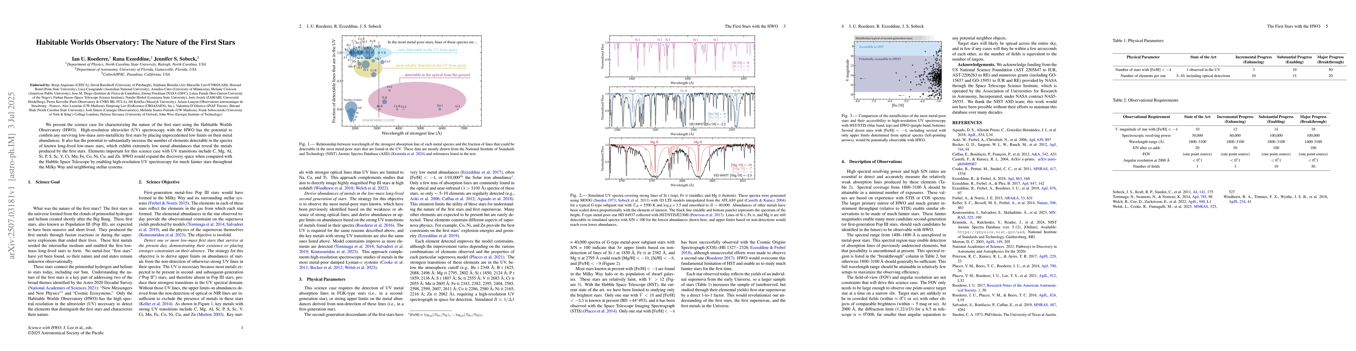 We present the science case for characterizing the nature of the first stars using the Habitable Worlds Observatory (HWO). High-resolution ultraviolet (UV) spectroscopy with the HWO has the potential to confirm any surviving low-mass zero-metallicity first stars by placing unprecedented low limits on their metal abundances. It also has the potential to substantially increase the number of elements detectable in the spectra of known long-lived low-mass stars, which exhibit extremely low metal abundances that reveal the metals produced by the first stars. Elements important for this science case with UV transitions include C, Mg, Al, Si, P, S, Sc, V, Cr, Mn, Fe, Co, Ni, Cu, and Zn. HWO would expand the discovery space when compared with the Hubble Space Telescope by enabling high-resolution UV spectroscopy for much fainter stars throughout the Milky Way and neighboring stellar systems.
