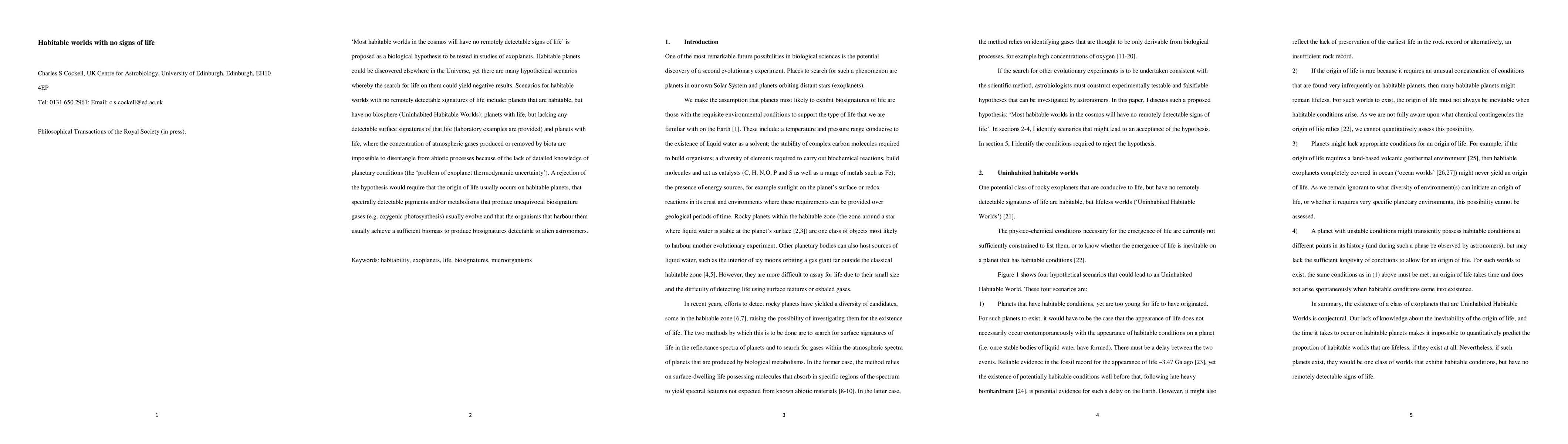 'Most habitable worlds in the cosmos will have no remotely detectable signs of life' is proposed as a biological hypothesis to be tested in studies of exoplanets. Habitable planets could be discovered elsewhere in the Universe, yet there are many hypothetical scenarios whereby the search for life on them could yield negative results. Scenarios for habitable worlds with no remotely detectable signatures of life include: planets that are habitable, but have no biosphere (Uninhabited Habitable Worlds); planets with life, but lacking any detectable surface signatures of that life (laboratory examples are provided) and planets with life, where the concentration of atmospheric gases produced or removed by biota are impossible to disentangle from abiotic processes because of the lack of detailed knowledge of planetary conditions (the 'problem of exoplanet thermodynamic uncertainty'). A rejection of the hypothesis would require that the origin of life usually occurs on habitable planets, that spectrally detectable pigments and/or metabolisms that produce unequivocal biosignature gases (e.g. oxygenic photosynthesis) usually evolve and that the organisms that harbour them usually achieve a sufficient biomass to produce biosignatures detectable to alien astronomers.