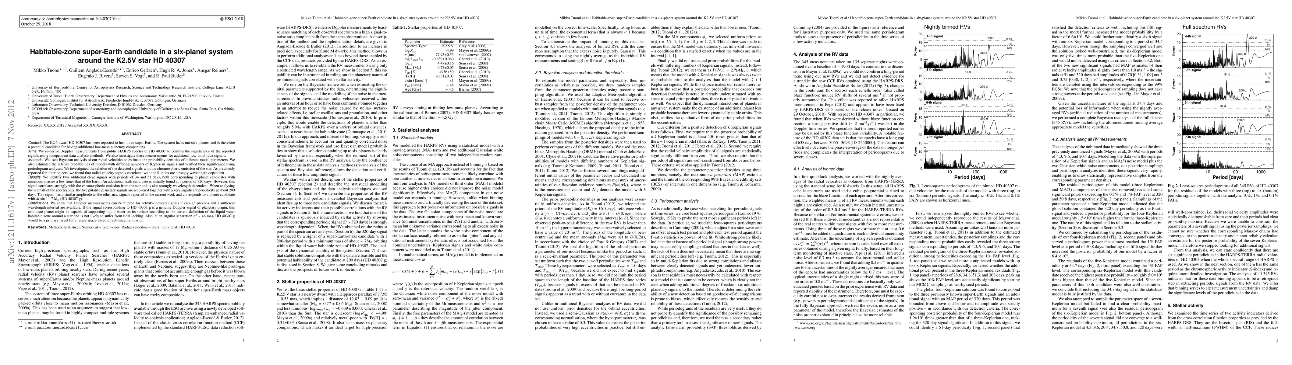 The research re-analyzed radial velocity data of the K2.5 dwarf star HD 40307, confirming three known super-Earths and identifying two additional super-Earth candidates with periods of 34 and 51 days. A sixth candidate at 320 days was also initially detected but deemed less reliable due to correlation with chromospheric emission. The study used Bayesian analysis and periodogram analyses to validate these findings, highlighting a diverse six-planet system with potential habitable-zone candidates.