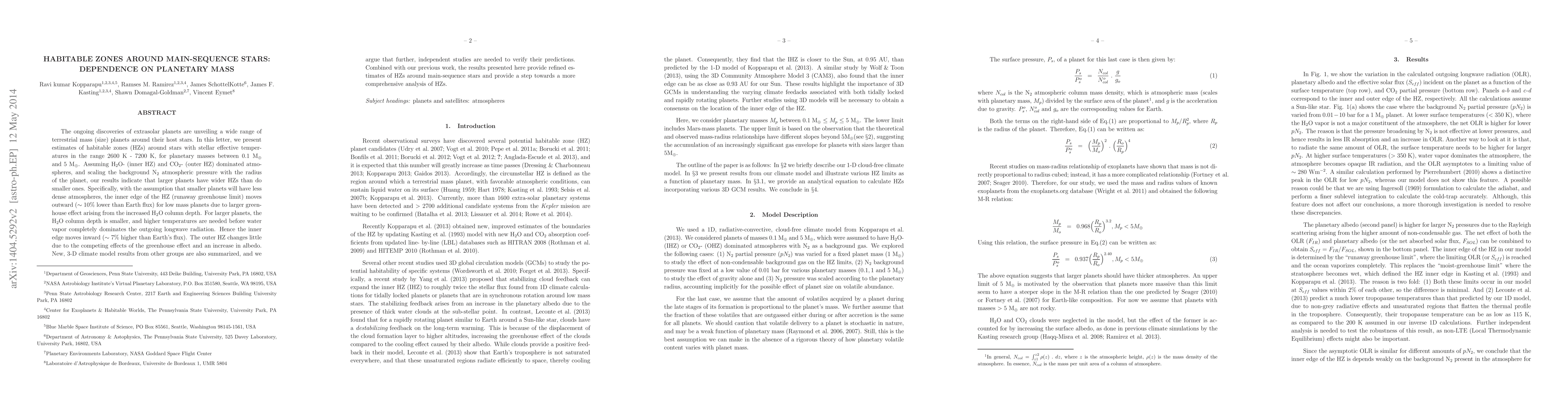 This paper estimates habitable zones around main-sequence stars for planets ranging from 0.1 to 5 Earth masses, finding that larger planets have wider habitable zones. The inner edge of the habitable zone shifts outward for smaller planets due to a stronger greenhouse effect, while it moves inward for larger planets due to lower H2O column depths.