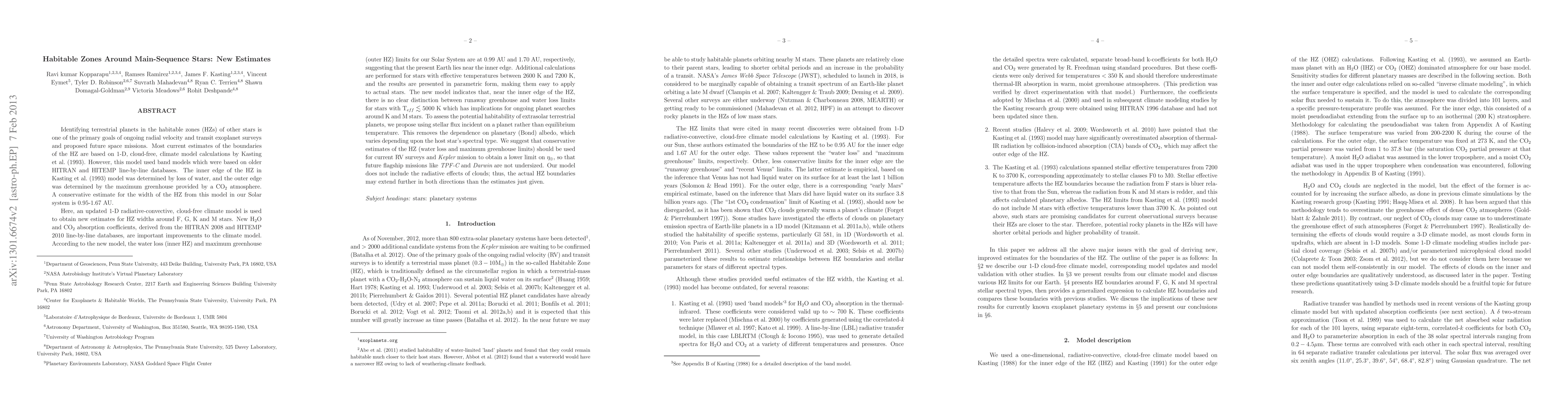 This paper updates estimates of the habitable zones (HZs) around main-sequence stars using a new 1-D radiative-convective climate model, finding the Earth near the inner edge of the HZ at 0.99 AU. The model suggests that stars with effective temperatures below 5000 K may not have clear distinctions between greenhouse and water loss limits, impacting planet searches.