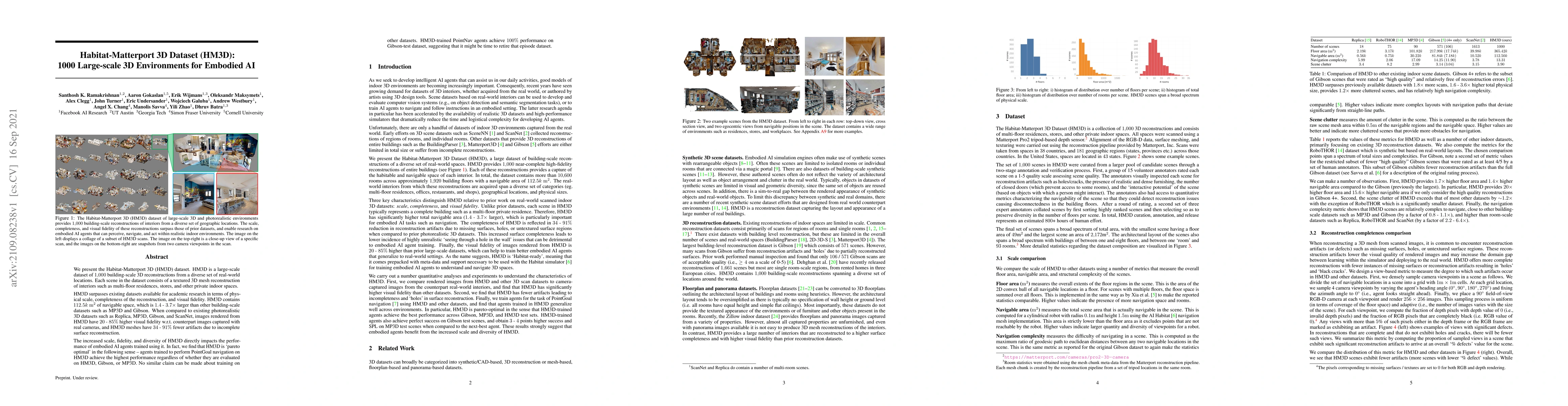 The Habitat-Matterport 3D (HM3D) dataset comprises 1,000 large-scale 3D reconstructions of real-world indoor environments, surpassing existing datasets in scale, completeness, and visual fidelity. HM3D-trained embodied AI agents achieve superior performance on navigation tasks, indicating its optimal use for training.