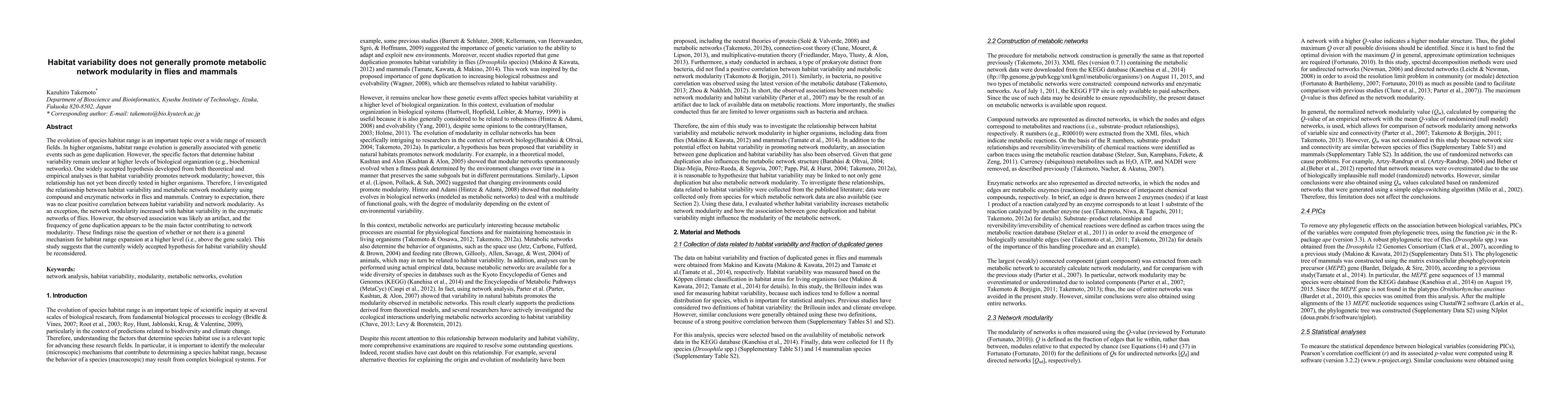The evolution of species habitat range is an important topic over a wide range of research fields. In higher organisms, habitat range evolution is generally associated with genetic events such as gene duplication. However, the specific factors that determine habitat variability remain unclear at higher levels of biological organization (e.g., biochemical networks). One widely accepted hypothesis developed from both theoretical and empirical analyses is that habitat variability promotes network modularity; however, this relationship has not yet been directly tested in higher organisms. Therefore, I investigated the relationship between habitat variability and metabolic network modularity using compound and enzymatic networks in flies and mammals. Contrary to expectation, there was no clear positive correlation between habitat variability and network modularity. As an exception, the network modularity increased with habitat variability in the enzymatic networks of flies. However, the observed association was likely an artifact, and the frequency of gene duplication appears to be the main factor contributing to network modularity. These findings raise the question of whether or not there is a general mechanism for habitat range expansion at a higher level (i.e., above the gene scale). This study suggests that the currently widely accepted hypothesis for habitat variability should be reconsidered.