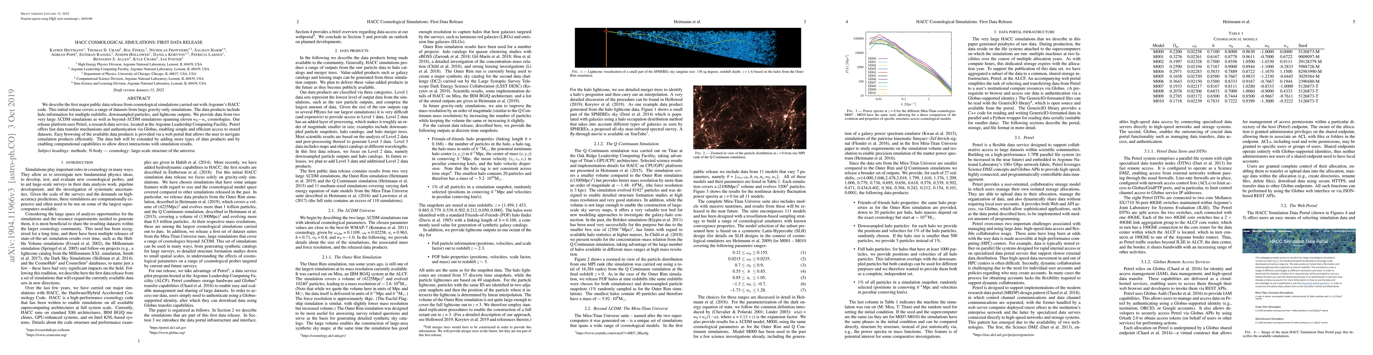 The HACC Cosmological Simulations first data release provides extensive datasets from gravity-only simulations, including halo information, down-sampled particles, and lightcone outputs, accessible via the Petrel platform at Argonne Leadership Computing Facility. Future updates will expand data types and computational capabilities.