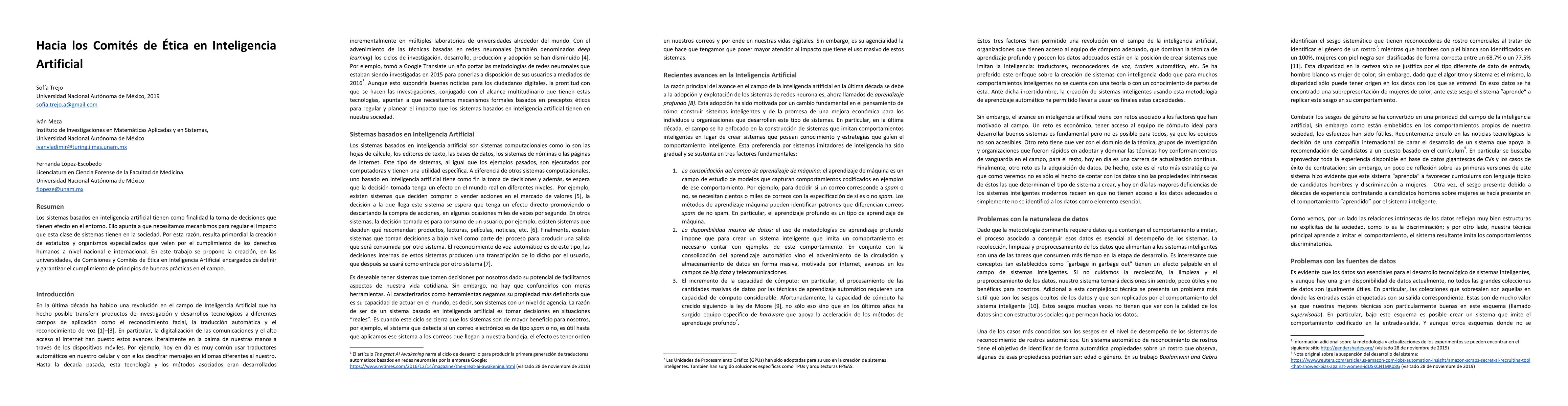 The goal of Artificial Intelligence based systems is to take decisions that have an effect in their environment and impact society. This points out to the necessity of mechanism that regulate the impact of this type of system in society. For this reason, it is priority to create the rules and specialized organizations that can oversight the following of such rules, particularly that human rights precepts at local and international level. This work proposes the creation, at the universities, of Ethical Committees or Commissions specialized on Artificial Intelligence that would be in charge of define the principles and will guarantee the following of good practices in the field Artificial Intelligence.