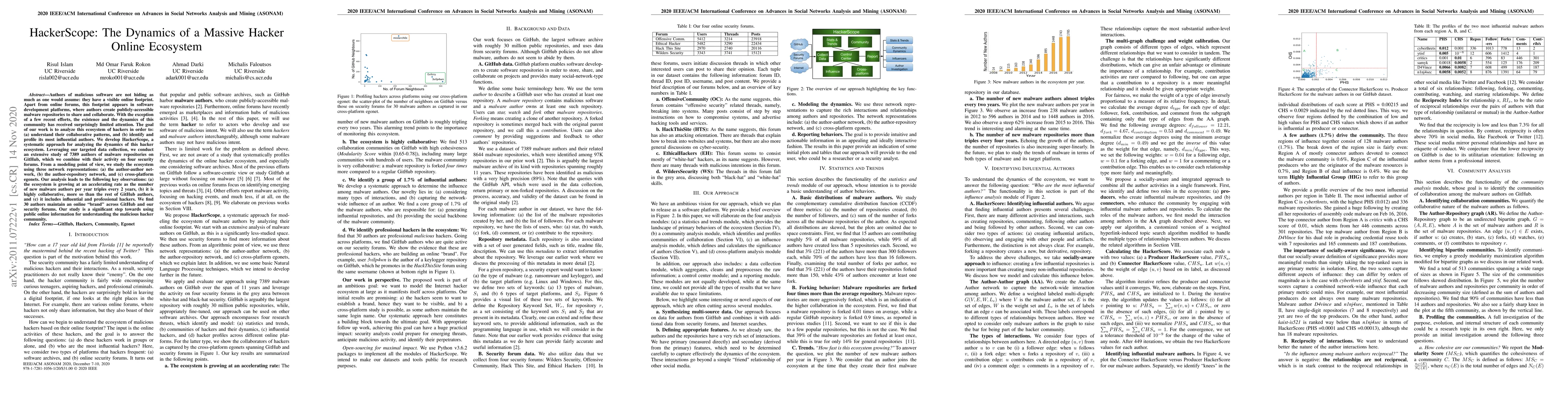 Authors of malicious software are not hiding as much as one would assume: they have a visible online footprint. Apart from online forums, this footprint appears in software development platforms, where authors create publicly-accessible malware repositories to share and collaborate. With the exception of a few recent efforts, the existence and the dynamics of this community has received surprisingly limited attention. The goal of our work is to analyze this ecosystem of hackers in order to: (a) understand their collaborative patterns, and (b) identify and profile its most influential authors. We develop HackerScope, a systematic approach for analyzing the dynamics of this hacker ecosystem. Leveraging our targeted data collection, we conduct an extensive study of 7389 authors of malware repositories on GitHub, which we combine with their activity on four security forums. From a modeling point of view, we study the ecosystem using three network representations: (a) the author-author network, (b) the author-repository network, and (c) cross-platform egonets. Our analysis leads to the following key observations: (a) the ecosystem is growing at an accelerating rate as the number of new malware authors per year triples every 2 years, (b) it is highly collaborative, more so than the rest of GitHub authors, and (c) it includes influential and professional hackers. We find 30 authors maintain an online "brand" across GitHub and our security forums. Our study is a significant step towards using public online information for understanding the malicious hacker community.