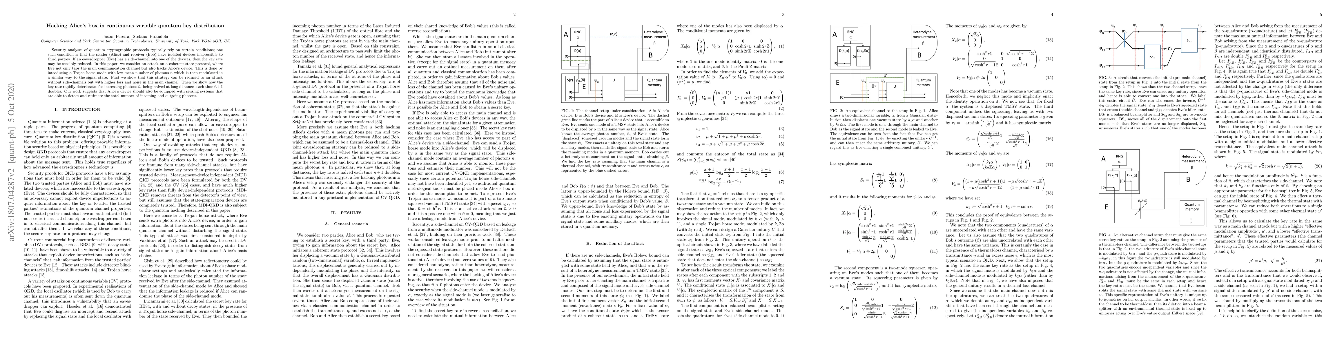 This paper explores a side-channel attack on a coherent-state quantum key distribution (CV-QKD) protocol where Eve hacks Alice's device by introducing a Trojan horse mode. The study shows that the key rate significantly deteriorates with increasing photon numbers, suggesting the need for photon-counting systems in Alice's device.
