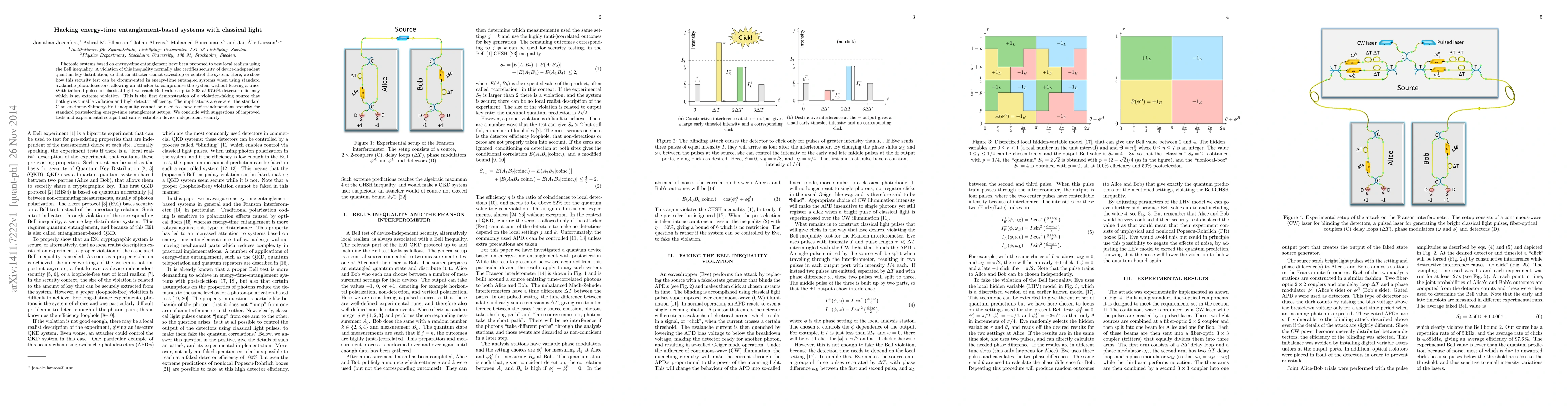 Photonic systems based on energy-time entanglement have been proposed to test local realism using the Bell inequality. A violation of this inequality normally also certifies security of device-independent quantum key distribution, so that an attacker cannot eavesdrop or control the system. Here, we show how this security test can be circumvented in energy-time entangled systems when using standard avalanche photodetectors, allowing an attacker to compromise the system without leaving a trace. With tailored pulses of classical light we reach Bell values up to 3.63 at 97.6% detector efficiency which is an extreme violation. This is the first demonstration of a violation-faking source that both gives tunable violation and high detector efficiency. The implications are severe: the standard Clauser-Horne-Shimony-Holt inequality cannot be used to show device-independent security for standard postselecting energy-time entanglement setups. We conclude with suggestions of improved tests and experimental setups that can re-establish device-independent security.