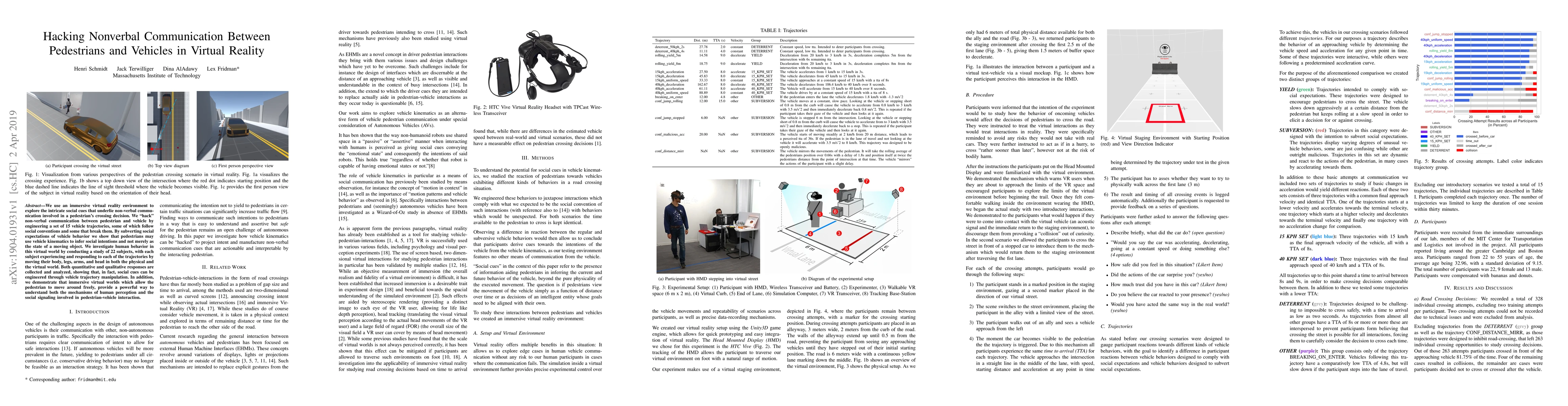 We use an immersive virtual reality environment to explore the intricate social cues that underlie non-verbal communication involved in a pedestrian's crossing decision. We "hack" non-verbal communication between pedestrian and vehicle by engineering a set of 15 vehicle trajectories, some of which follow social conventions and some that break them. By subverting social expectations of vehicle behavior we show that pedestrians may use vehicle kinematics to infer social intentions and not merely as the state of a moving object. We investigate human behavior in this virtual world by conducting a study of 22 subjects, with each subject experiencing and responding to each of the trajectories by moving their body, legs, arms, and head in both the physical and the virtual world. Both quantitative and qualitative responses are collected and analyzed, showing that, in fact, social cues can be engineered through vehicle trajectory manipulation. In addition, we demonstrate that immersive virtual worlds which allow the pedestrian to move around freely, provide a powerful way to understand both the mechanisms of human perception and the social signaling involved in pedestrian-vehicle interaction.