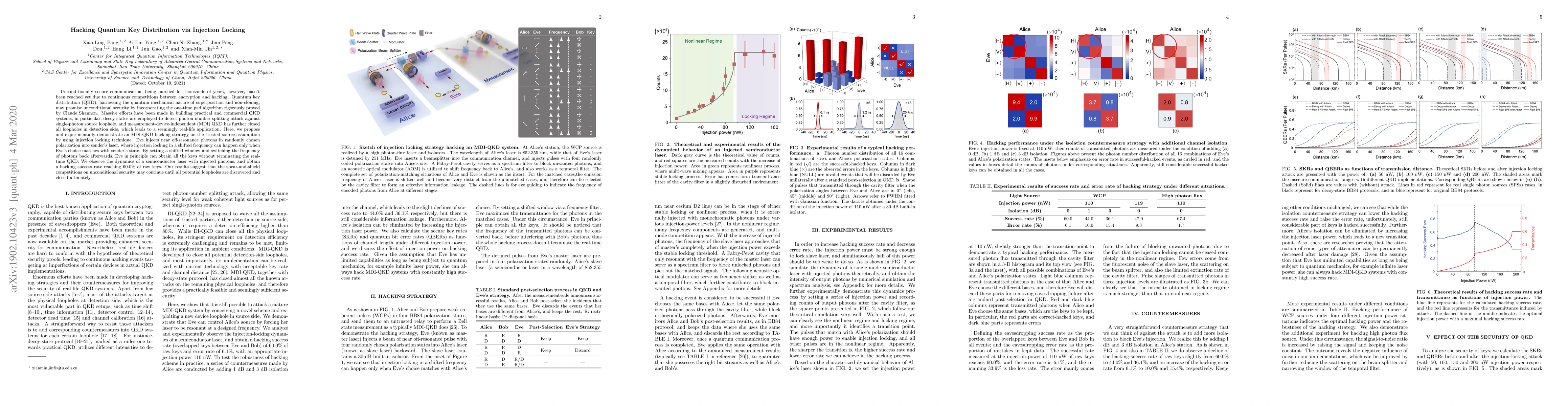 This paper proposes and demonstrates a hacking technique for measurement-device-independent quantum key distribution (MDI-QKD) using injection locking. The method allows an eavesdropper (Eve) to obtain all keys by injecting off-resonance photons into the sender's laser, achieving a 60.0% success rate in raw keys, highlighting ongoing vulnerabilities in quantum security systems.
