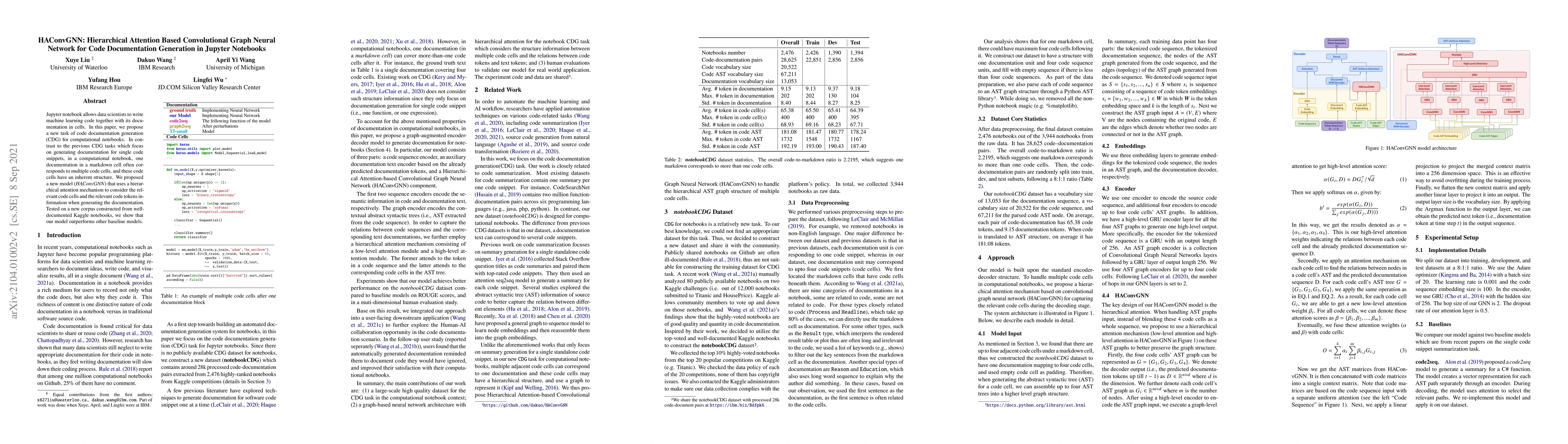 This paper introduces HAConvGNN, a hierarchical attention-based convolutional graph neural network for generating code documentation in Jupyter notebooks. The model considers both relevant code cells and tokens, outperforming baselines on a corpus from Kaggle notebooks.