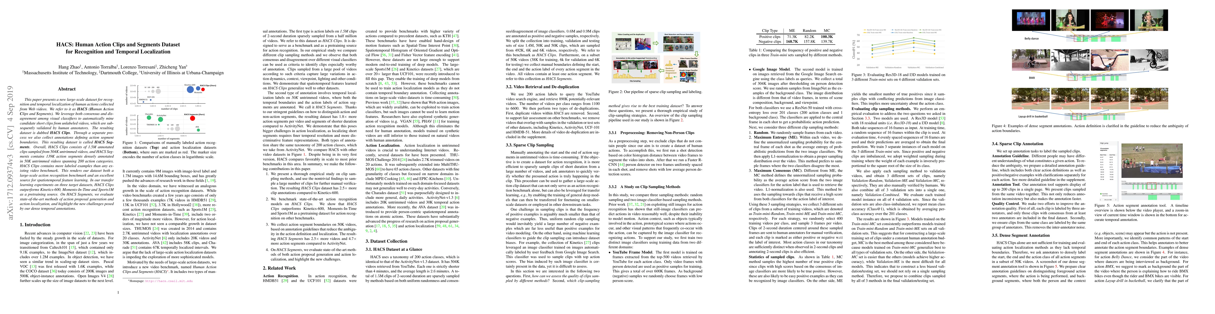 This paper presents a new large-scale dataset for recognition and temporal localization of human actions collected from Web videos. We refer to it as HACS (Human Action Clips and Segments). We leverage both consensus and disagreement among visual classifiers to automatically mine candidate short clips from unlabeled videos, which are subsequently validated by human annotators. The resulting dataset is dubbed HACS Clips. Through a separate process we also collect annotations defining action segment boundaries. This resulting dataset is called HACS Segments. Overall, HACS Clips consists of 1.5M annotated clips sampled from 504K untrimmed videos, and HACS Seg-ments contains 139K action segments densely annotatedin 50K untrimmed videos spanning 200 action categories. HACS Clips contains more labeled examples than any existing video benchmark. This renders our dataset both a large scale action recognition benchmark and an excellent source for spatiotemporal feature learning. In our transferlearning experiments on three target datasets, HACS Clips outperforms Kinetics-600, Moments-In-Time and Sports1Mas a pretraining source. On HACS Segments, we evaluate state-of-the-art methods of action proposal generation and action localization, and highlight the new challenges posed by our dense temporal annotations.