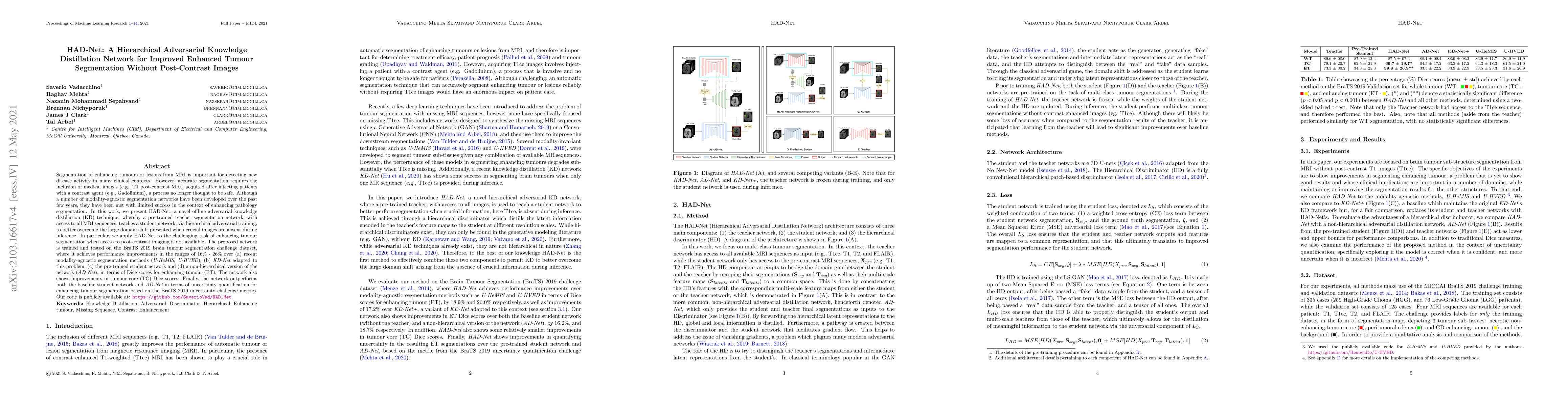 HAD-Net introduces a hierarchical adversarial knowledge distillation technique to improve tumour segmentation from MRI without post-contrast images, achieving significant performance improvements over existing methods in Dice scores and uncertainty quantification. The network demonstrates 16%-26% better results compared to several baselines on the BraTS 2019 dataset.