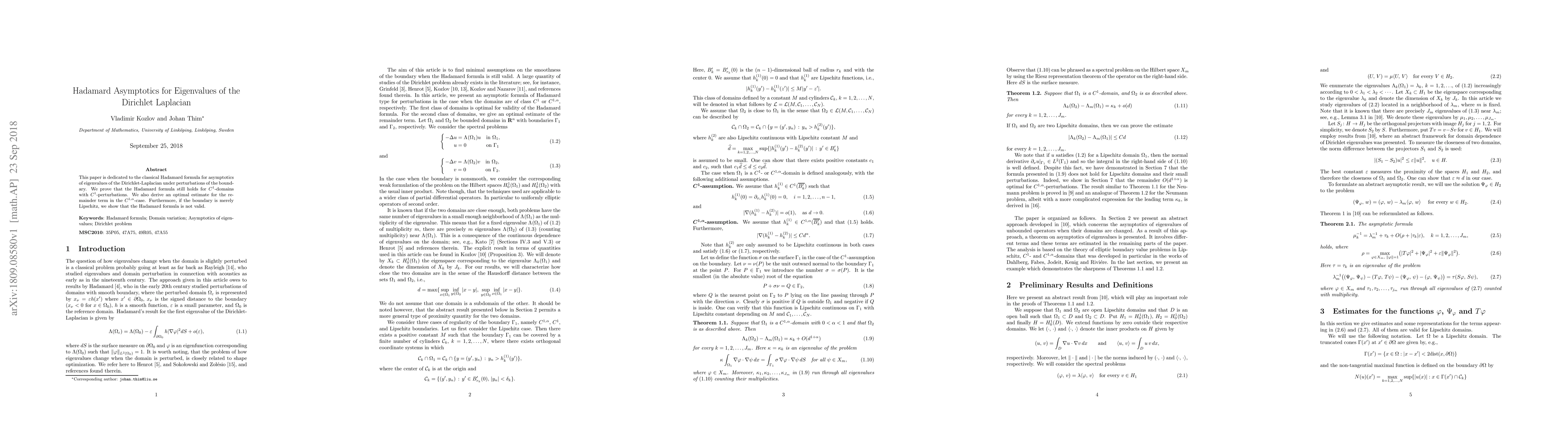 This paper proves the Hadamard formula for the asymptotics of Dirichlet Laplacian eigenvalues under $C^1$ boundary perturbations, providing an optimal estimate for the remainder term in the $C^{1,\alpha}$ case, and demonstrating the formula's invalidity for merely Lipschitz boundaries.