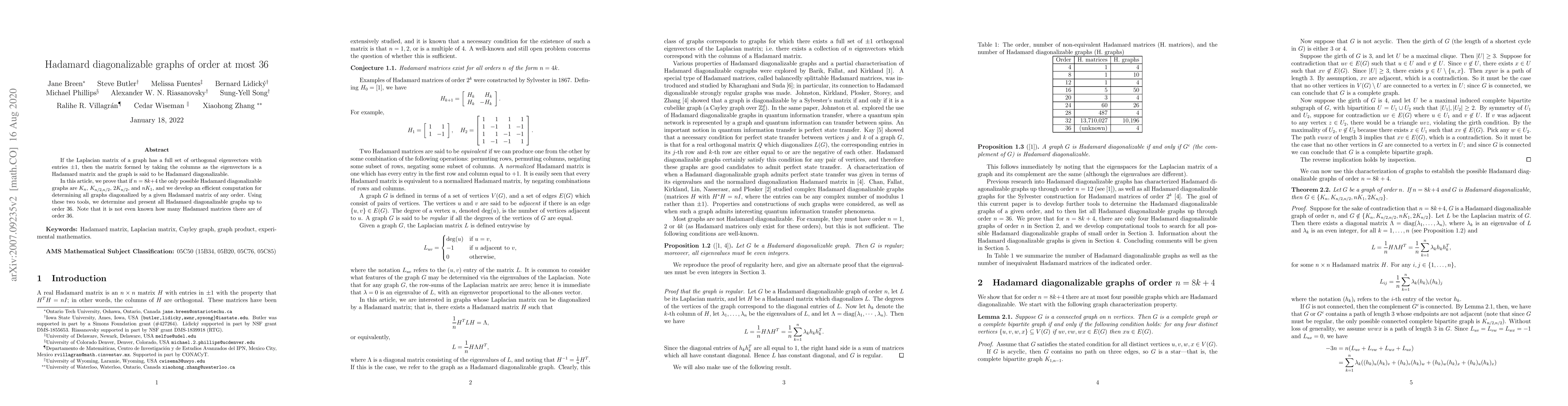 This paper explores Hadamard diagonalizable graphs, proving that for $n=8k+4$, only specific types of graphs can be Hadamard diagonalizable. It also develops a computational method to identify all such graphs up to order 36.