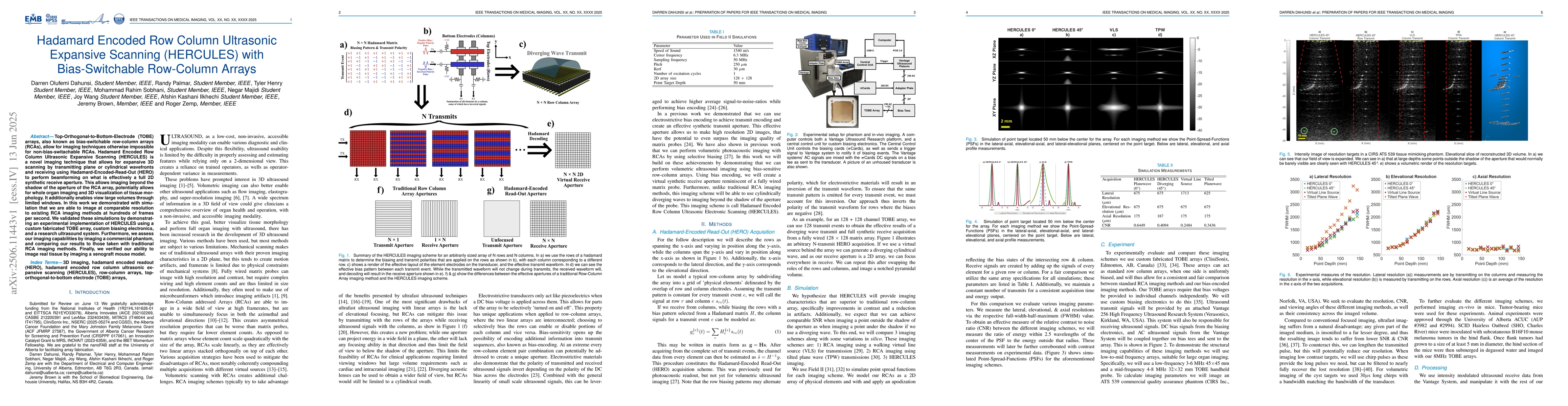 Top-Orthogonal-to-Bottom-Electrode (TOBE) arrays, also known as bias-switchable row-column arrays (RCAs), allow for imaging techniques otherwise impossible for non-bias-switachable RCAs. Hadamard Encoded Row Column Ultrasonic Expansive Scanning (HERCULES) is a novel imaging technique that allows for expansive 3D scanning by transmitting plane or cylindrical wavefronts and receiving using Hadamard-Encoded-Read-Out (HERO) to perform beamforming on what is effectively a full 2D synthetic receive aperture. This allows imaging beyond the shadow of the aperture of the RCA array, potentially allows for whole organ imaging and 3D visualization of tissue morphology. It additionally enables view large volumes through limited windows. In this work we demonstrated with simulation that we are able to image at comparable resolution to existing RCA imaging methods at hundreds of frames per second. We validated these simulations by demonstrating an experimental implementation of HERCULES using a custom fabricated TOBE array, custom biasing electronics, and a research ultrasound system. Furthermore, we assess our imaging capabilities by imaging a commercial phantom, and comparing our results to those taken with traditional RCA imaging methods. Finally, we verified our ability to image real tissue by imaging a xenograft mouse model.