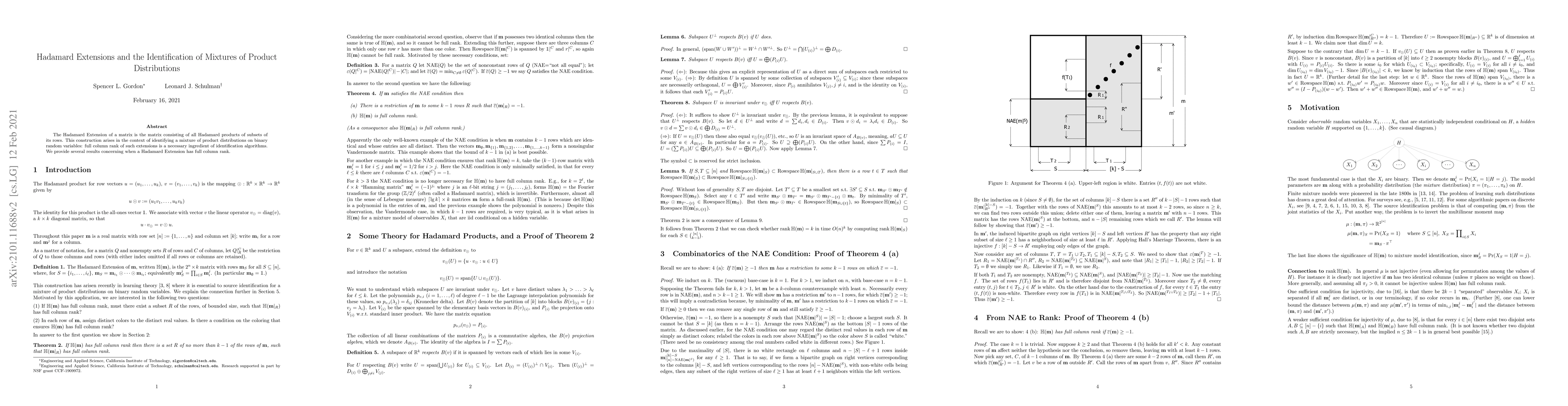 This paper explores the Hadamard Extension of matrices, which are constructed from Hadamard products of matrix rows, and its application in identifying mixtures of product distributions on binary random variables. The authors investigate conditions under which these extensions have full column rank, crucial for effective identification algorithms.