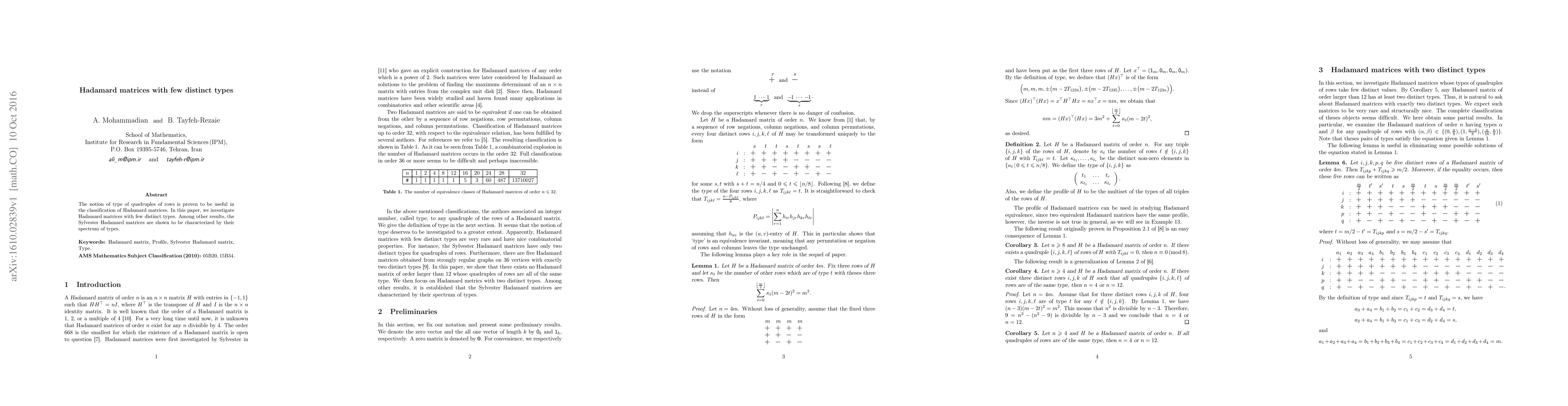 The notion of type of quadruples of rows is proven to be useful in the classification of Hadamard matrices. In this paper, we investigate Hadamard matrices with few distinct types. Among other results, the Sylvester Hadamard matrices are shown to be characterized by their spectrum of types.