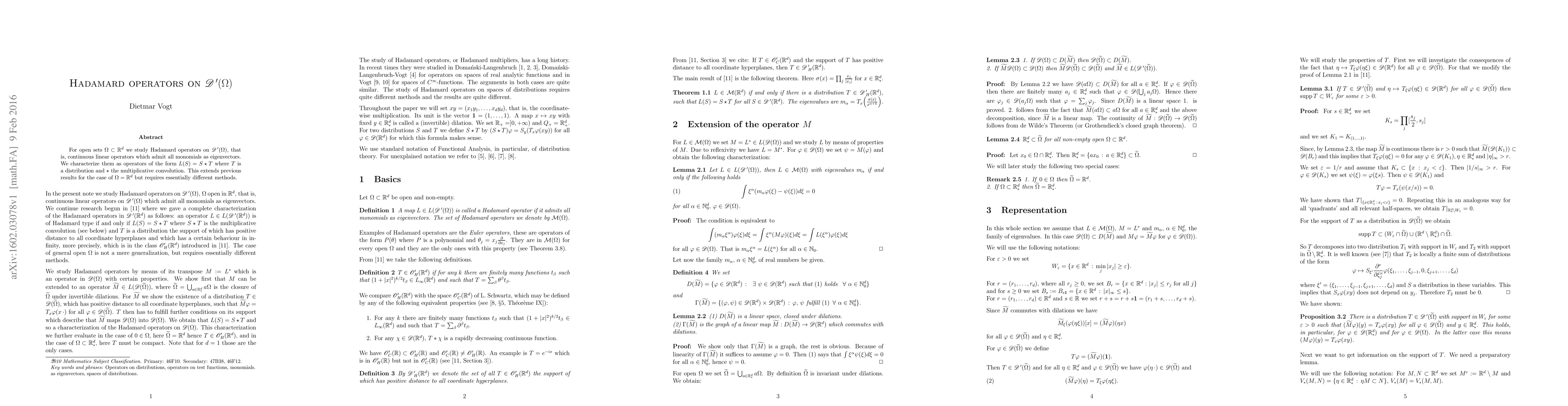 For open sets $\Omega\subset \mathbb{R}^d$ we study Hadamard operators on $\mathscr{D}'(\Omega)$, that is, continuous linear operators which admit all monomials as eigenvectors. We characterize them as operators of the form $L(S)=S\star T$ where $T$ is a distribution and $\star$ the multiplicative convolution. This extends previous results for the case of $\Omega=\mathbb{R}^d$ but requires essentially different methods.