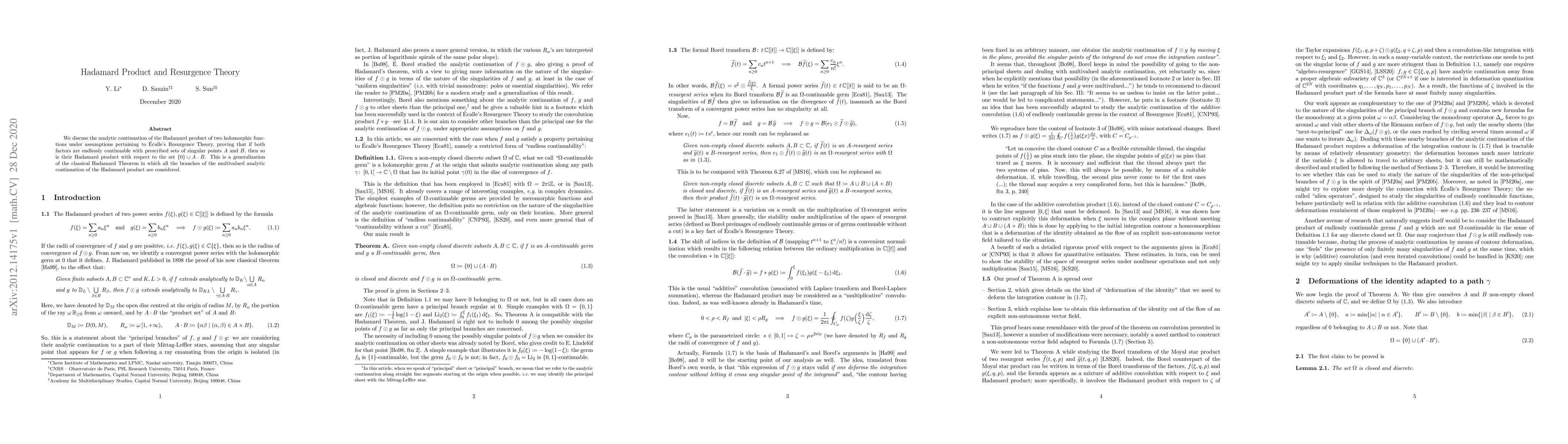 We discuss the analytic continuation of the Hadamard product of two holomorphic functions under assumptions pertaining to Ecalle's Resurgence Theory, proving that if both factors are endlessly continuable with prescribed sets of singular points $A$ and $B$, then so is their Hadamard product with respect to the set $\{0\}\cup A \cdot B$. In this generalization of the classical Hadamard Theorem, all the branches of the multivalued analytic continuation of the Hadamard product are considered.