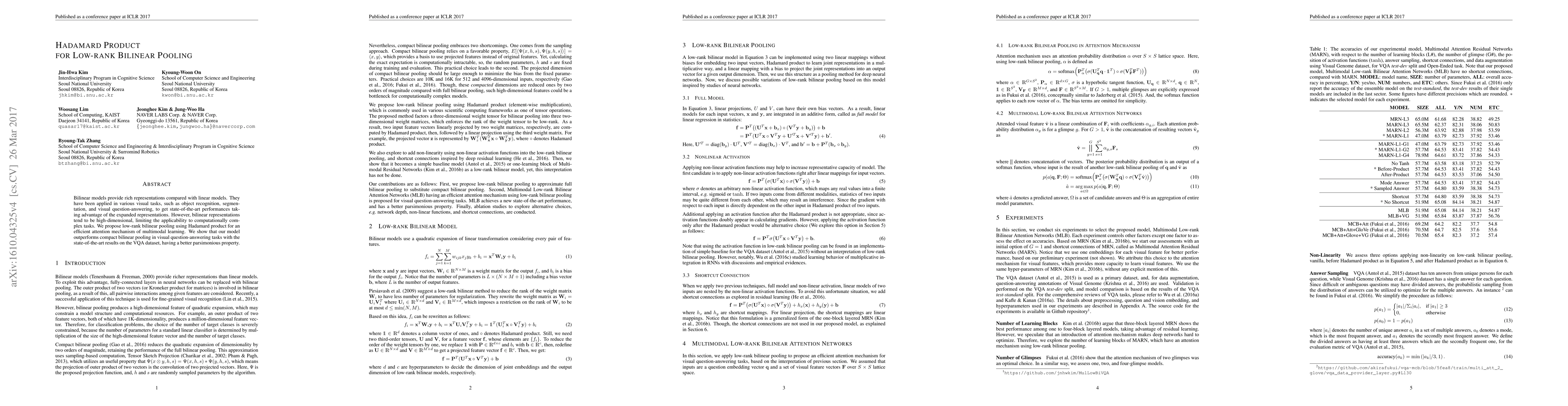 This paper proposes low-rank bilinear pooling using the Hadamard product to efficiently manage high-dimensional bilinear representations in multimodal learning. The proposed model outperforms compact bilinear pooling in visual question-answering tasks, achieving state-of-the-art results on the VQA dataset.