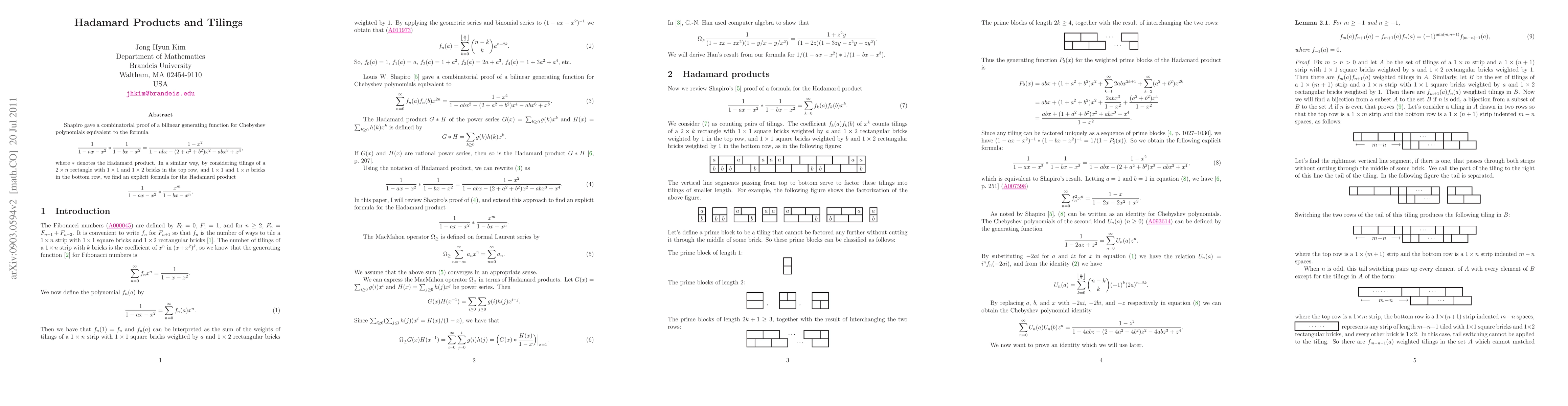 Louis W. Shapiro gave a combinatorial proof of a bilinear generating function for Chebyshev polynomials equivalent to the formula 1/(1-ax-x^2) * 1/(1-bx-x^2) = (1-x^2)/(1-abx-(2+a^2+b^2)x^2 -abx^3+x^4), where * denotes the Hadamard product. In a similar way, by considering tilings of a 2 by n rectangle with 1 by 1 and 1 by 2 bricks in the top row, and 1 by 1 and 1 by n bricks in the bottom row, we find an explicit formula for the Hadamard product 1/(1-ax-x^2) * x^m/(1-bx-x^n).