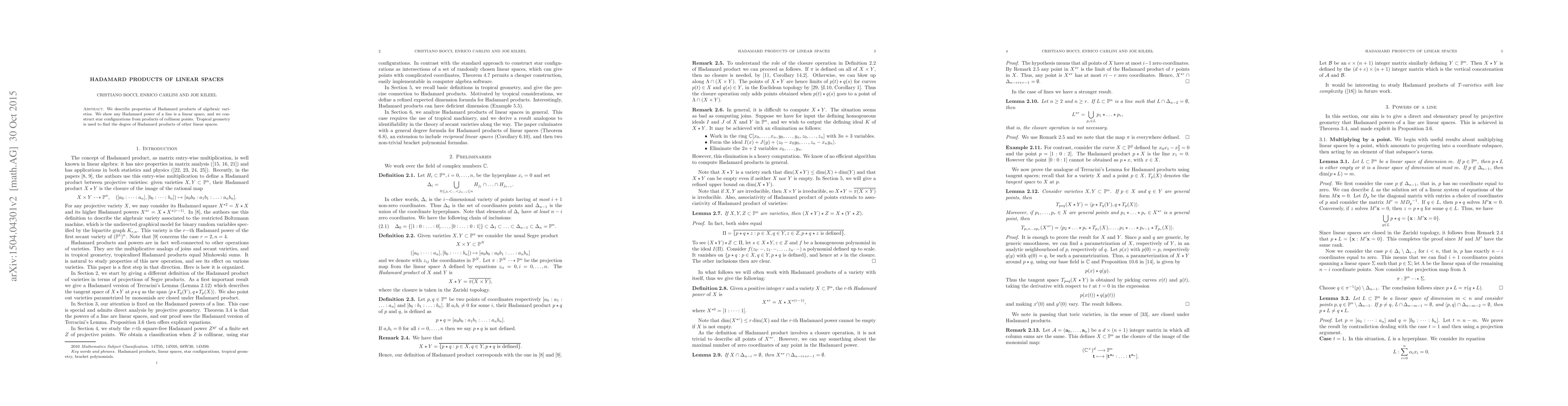 This paper investigates Hadamard products of algebraic varieties, demonstrating that any Hadamard power of a line results in a linear space and constructing star configurations from collinear points, with tropical geometry aiding in determining the degree of Hadamard products for other linear spaces.
