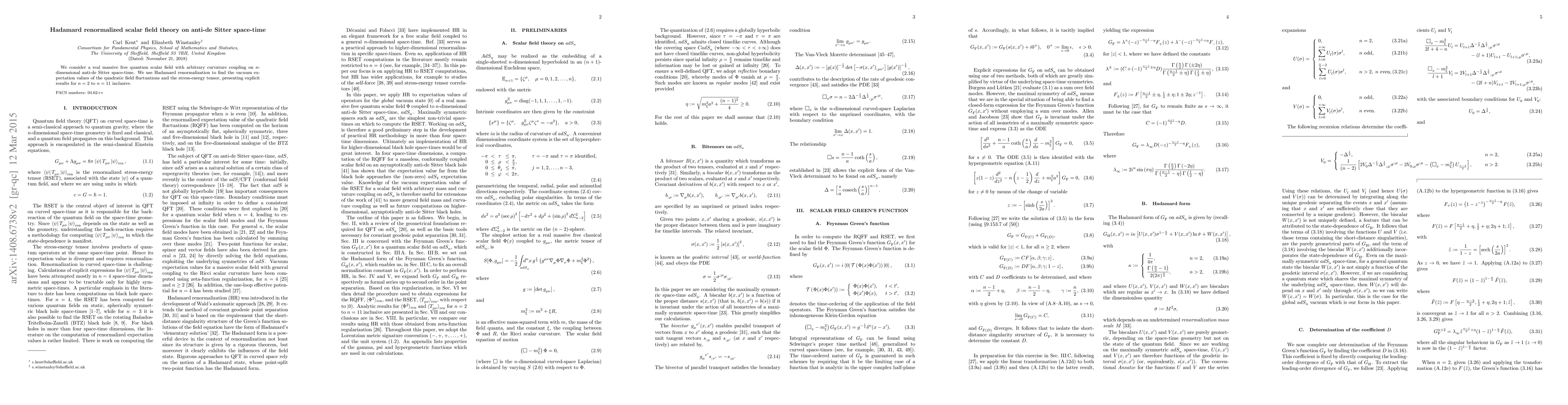 This paper investigates a massive free quantum scalar field on anti-de Sitter space-time using Hadamard renormalization to compute vacuum expectation values for quadratic fluctuations and the stress-energy tensor, with explicit results provided for dimensions ranging from $n=2$ to $n=11$.
