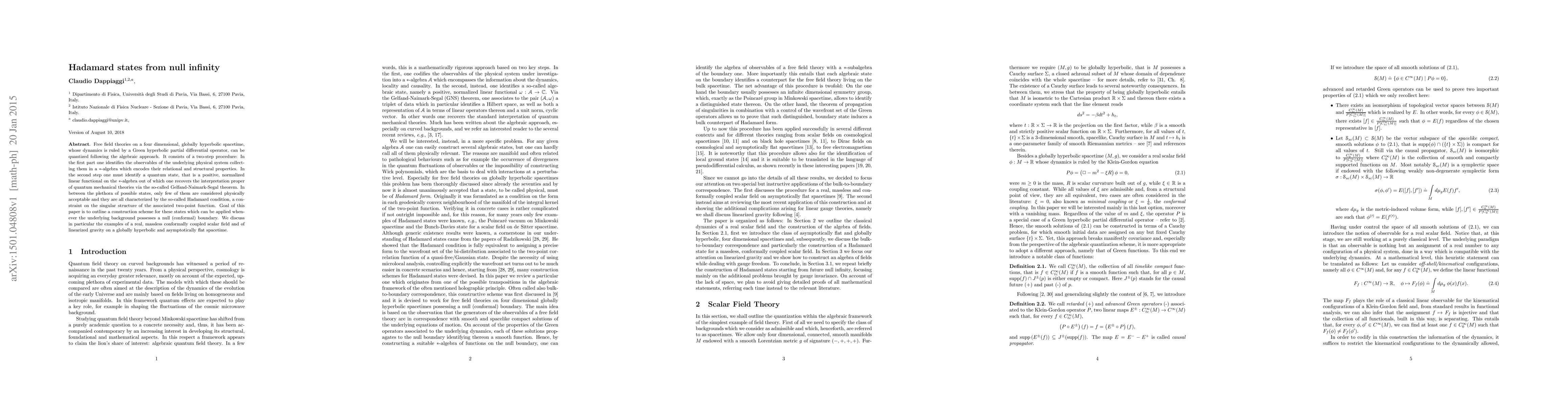 Free field theories on a four dimensional, globally hyperbolic spacetime, whose dynamics is ruled by a Green hyperbolic partial differential operator, can be quantized following the algebraic approach. It consists of a two-step procedure: In the first part one identifies the observables of the underlying physical system collecting them in a *-algebra which encodes their relational and structural properties. In the second step one must identify a quantum state, that is a positive, normalized linear functional on the *-algebra out of which one recovers the interpretation proper of quantum mechanical theories via the so-called Gelfand-Naimark-Segal theorem. In between the plethora of possible states, only few of them are considered physically acceptable and they are all characterized by the so-called Hadamard condition, a constraint on the singular structure of the associated two-point function. Goal of this paper is to outline a construction scheme for these states which can be applied whenever the underlying background possesses a null (conformal) boundary. We discuss in particular the examples of a real, massless conformally coupled scalar field and of linearized gravity on a globally hyperbolic and asymptotically flat spacetime.