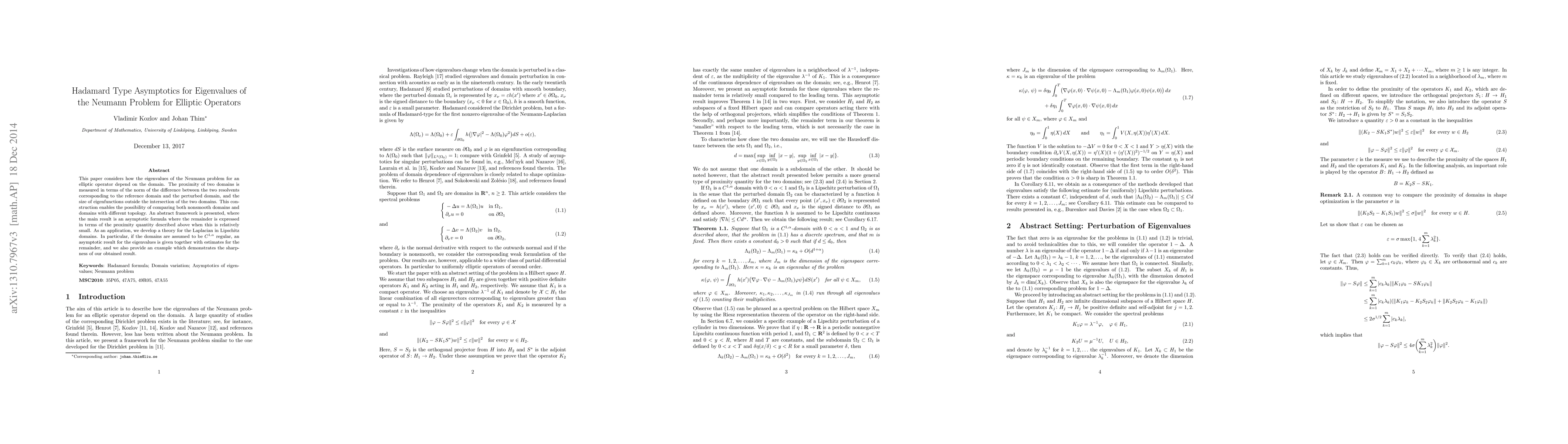 The paper investigates how eigenvalues of the Neumann problem for elliptic operators change when moving between domains, providing an asymptotic formula that estimates the difference in eigenvalues based on domain proximity.