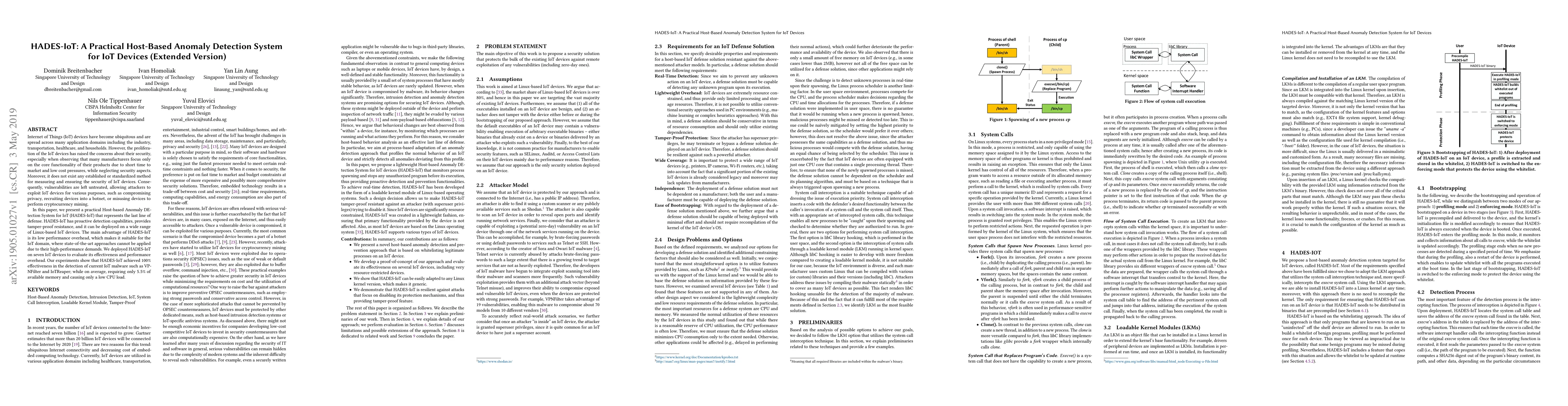 Internet of Things (IoT) devices have become ubiquitous and are spread across many application domains including the industry, transportation, healthcare, and households. However, the proliferation of the IoT devices has raised the concerns about their security, especially when observing that many manufacturers focus only on the core functionality of their products due to short time to market and low-cost pressures, while neglecting security aspects. Moreover, it does not exist any established or standardized method for measuring and ensuring the security of IoT devices. Consequently, vulnerabilities are left untreated, allowing attackers to exploit IoT devices for various purposes, such as compromising privacy, recruiting devices into a botnet, or misusing devices to perform cryptocurrency mining. In this paper, we present a practical Host-based Anomaly DEtection System for IoT (HADES-IoT) that represents the last line of defense. HADES-IoT has proactive detection capabilities, provides tamper-proof resistance, and it can be deployed on a wide range of Linux-based IoT devices. The main advantage of HADES-IoT is its low performance overhead, which makes it suitable for the IoT domain, where state-of-the-art approaches cannot be applied due to their high-performance demands. We deployed HADES-IoT on seven IoT devices to evaluate its effectiveness and performance overhead. Our experiments show that HADES-IoT achieved 100% effectiveness in the detection of current IoT malware such as VPNFilter and IoTReaper; while on average, requiring only 5.5% of available memory and causing only a low CPU load.