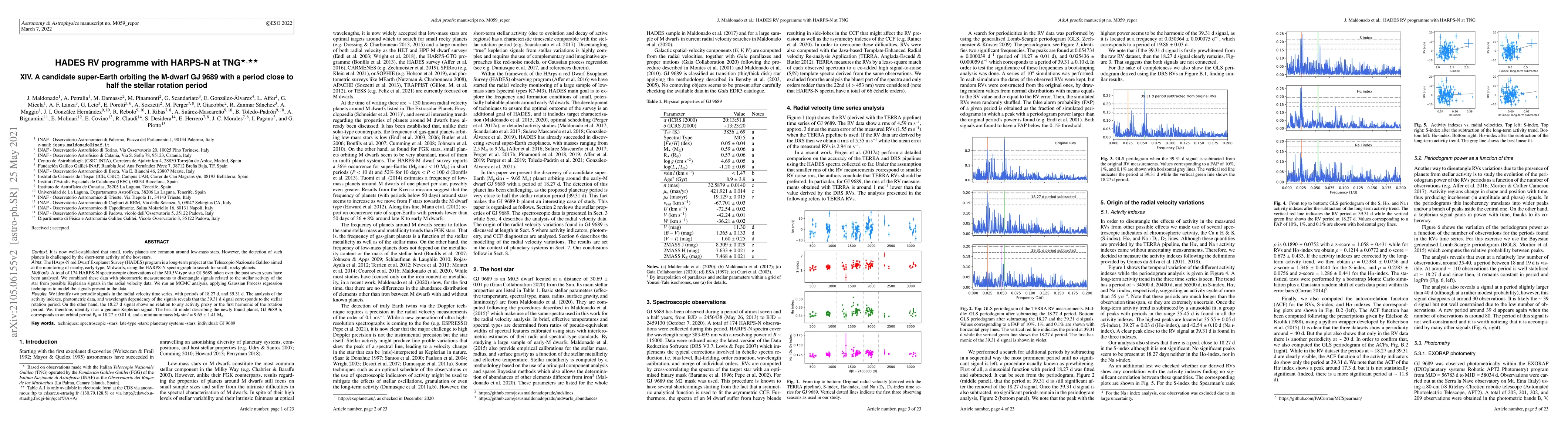 The HADES RV programme using the HARPS-N spectrograph at TNG identified a candidate super-Earth, GJ 9689 b, orbiting the M-dwarf GJ 9689 with a period of 18.27 days, close to half the stellar rotation period. The planet's minimum mass is estimated to be 9.65 Earth masses.