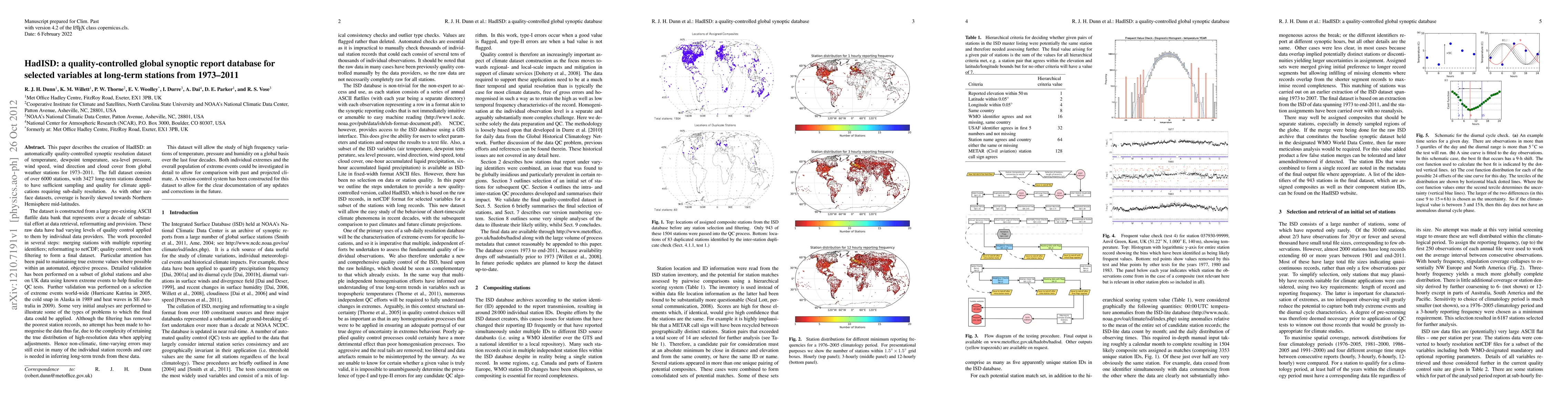 [Abridged] This paper describes the creation of HadISD: an automatically quality-controlled synoptic resolution dataset of temperature, dewpoint temperature, sea-level pressure, wind speed, wind direction and cloud cover from global weather stations for 1973--2011. The full dataset consists of over 6000 stations, with 3427 long-term stations deemed to have sufficient sampling and quality for climate applications requiring sub-daily resolution. As with other surface datasets, coverage is heavily skewed towards Northern Hemisphere mid-latitudes. The dataset is constructed from a large pre-existing ASCII flatfile data bank that represents over a decade of substantial effort at data retrieval, reformatting and provision. These raw data have had varying levels of quality control applied to them by individual data providers. The work proceeded in several steps: merging stations with multiple reporting identifiers; reformatting to netCDF; quality control; and then filtering to form a final dataset. Particular attention has been paid to maintaining true extreme values where possible within an automated, objective process. Detailed validation has been performed on a subset of global stations and also on UK data using known extreme events to help finalise the QC tests. Further validation was performed on a selection of extreme events world-wide (Hurricane Katrina in 2005, the cold snap in Alaska in 1989 and heat waves in SE Australia in 2009). Although the filtering has removed the poorest station records, no attempt has been made to homogenise the data thus far. Hence non-climatic, time-varying errors may still exist in many of the individual station records and care is needed in inferring long-term trends from these data. A version-control system has been constructed for this dataset to allow for the clear documentation of any updates and corrections in the future.