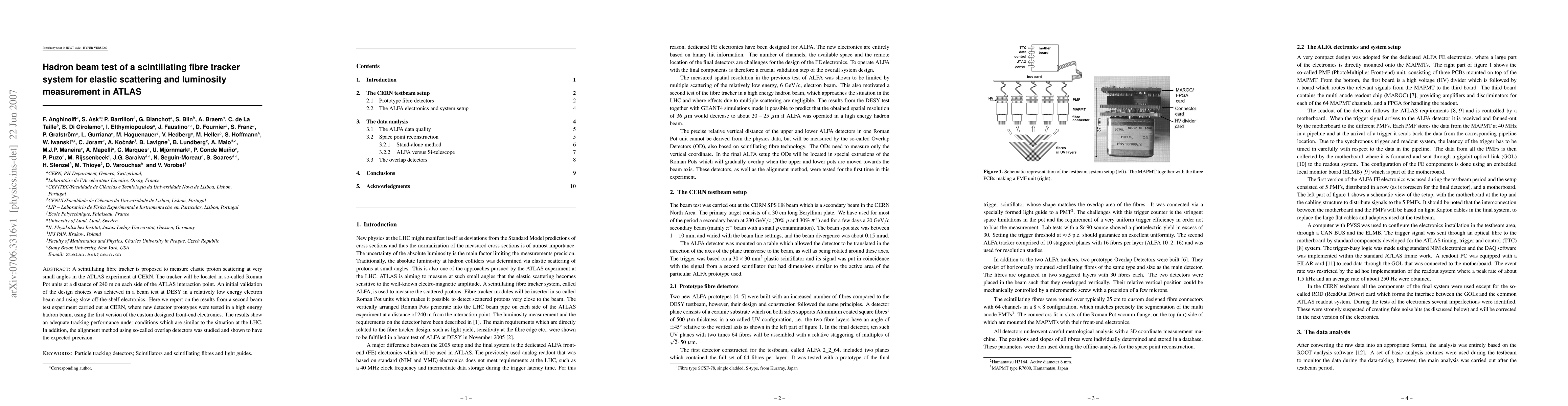This paper reports on a hadron beam test of a scintillating fibre tracker system designed for measuring elastic proton scattering at the ATLAS experiment. The test at CERN demonstrated adequate tracking performance and precision in alignment using overlap detectors, validating the system's readiness for use in the LHC environment.
