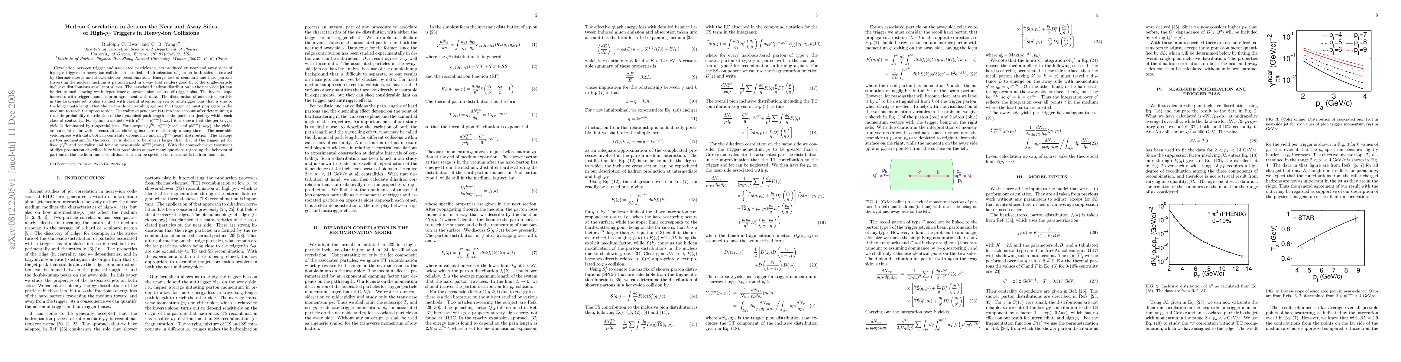 Correlation between trigger and associated particles in jets produced on near and away sides of high-p_T triggers in heavy-ion collisions is studied. Hadronization of jets on both sides is treated by thermal-shower and shower-shower recombination. Energy loss of semihard and hard partons traversing the nuclear medium is parametrized in a way that renders good fit of the single-particle inclusive distributions at all centralities. The associated hadron distribution in the near-side jet can be determined showing weak dependence on system size because of trigger bias. The inverse slope increases with trigger momentum in agreement with data. The distribution of associated particle in the away-side jet is also studied with careful attention given to antitrigger bias that is due to the longer path length that the away-side jet recoiling against the trigger jet must propagate in the medium to reach the opposite side. Centrality dependence is taken into account after determining a realistic probability distribution of the dynamical path length of the parton trajectory within each class of centrality. For symmetric dijets with p_T^{trig}=p_T^{assoc}(away) it is shown that the per-trigger yield is dominated by tangential jets. The average parton momentum for the recoil jet is shown to be always larger than that of the trigger jet for fixed p_T^{trig} and centrality and for any measurable p_T^{assoc}(away). With the comprehensive treatment of dijet production described here it is possible to answer many questions regarding the behavior of partons in the medium under conditions that can be specified on measurable hadron momenta.