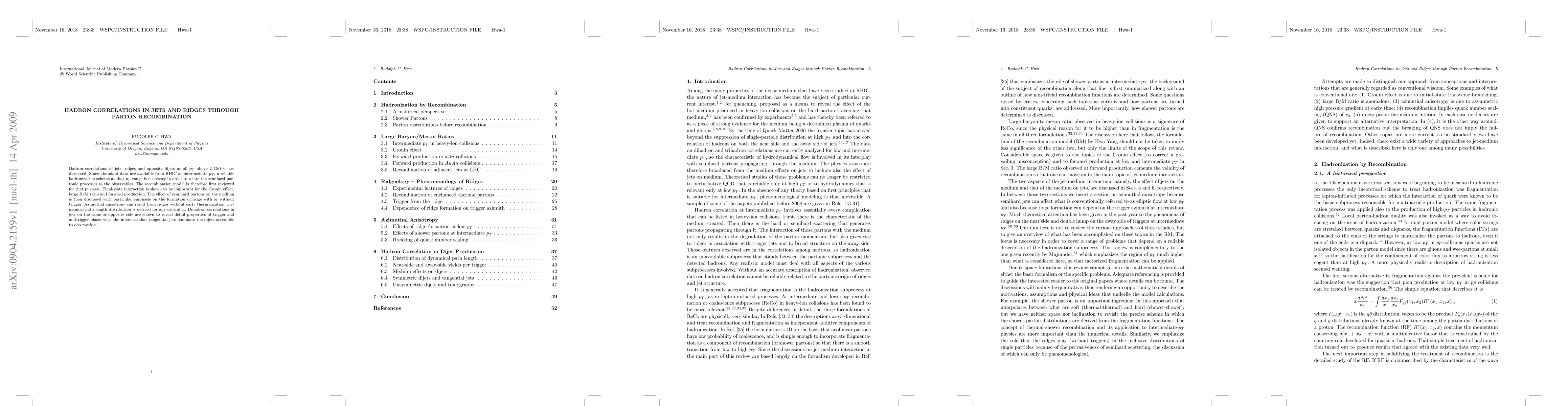 Hadron correlations in jets, ridges and opposite dijets at all $p_T$ above 2 GeV/c are discussed. Since abundant data are available from RHIC at intermediate $p_T$, a reliable hadronization scheme at that $p_T$ range is necessary in order to relate the semihard partonic processes to the observables. The recombination model is therefore first reviewed for that purpose. Final-state interaction is shown to be important for the Cronin effect, large B/M ratio and forward production. The effect of semihard partons on the medium is then discussed with particular emphasis on the formation of ridge with or without trigger. Azimuthal anisotropy can result from ridges without early thermalization. Dynamical path length distribution is derived for any centrality. Dihadron correlations in jets on the same or opposite side are shown to reveal detail properties of trigger and antitrigger biases with the inference that tangential jets dominate the dijets accessible to observation.