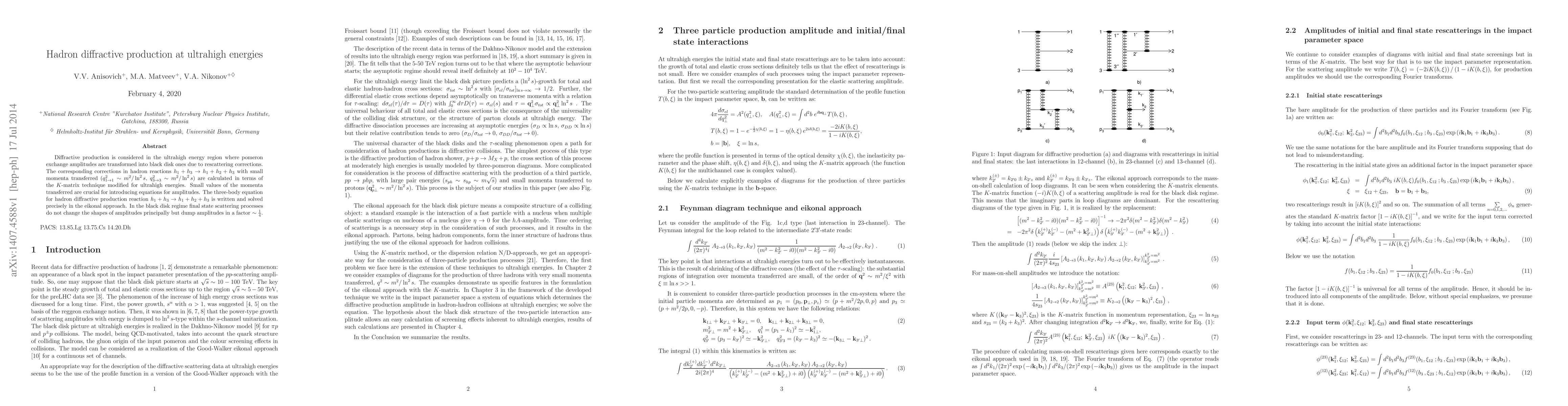 This paper investigates diffractive production in ultrahigh energy hadron reactions, focusing on the transition from pomeron exchange to black disk regimes due to rescattering corrections. It employs the $K$-matrix technique and solves the three-body equation in the eikonal approach, finding that final state scattering processes reduce amplitudes by a factor of $\sim\frac 14$ in the black disk regime.