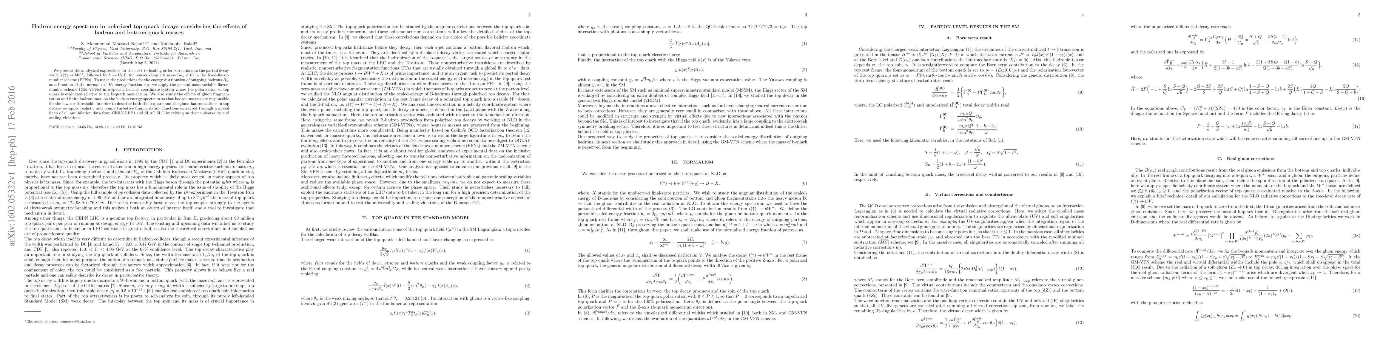 We present the analytical expressions for the next-to-leading order corrections to the partial decay width $t(\uparrow) \rightarrow bW^+$, followed by $b\rightarrow H_bX$, for nonzero b-quark mass ($m_b\neq 0$) in the fixed-flavor-number scheme (FFNs). To make the predictions for the energy distribution of outgoing hadrons $H_b$, as a function of the normalized $H_b$-energy fraction $x_H$, we apply the general-mass variable-flavor-number scheme (GM-VFNs) in a specific helicity coordinate system where the polarization of top quark is evaluated relative to the b-quark momentum. We also study the effects of gluon fragmentation and finite hadron mass on the hadron energy spectrum so that hadron masses are responsible for the low-$x_H$ threshold. In order to describe both the b-quark and the gluon hadronizations in top decays we apply realistic and nonperturbative fragmentation functions extracted through a global fit to $e^+e^-$ annihilation data from CERN LEP1 and SLAC SLC by relying on their universality and scaling violations.