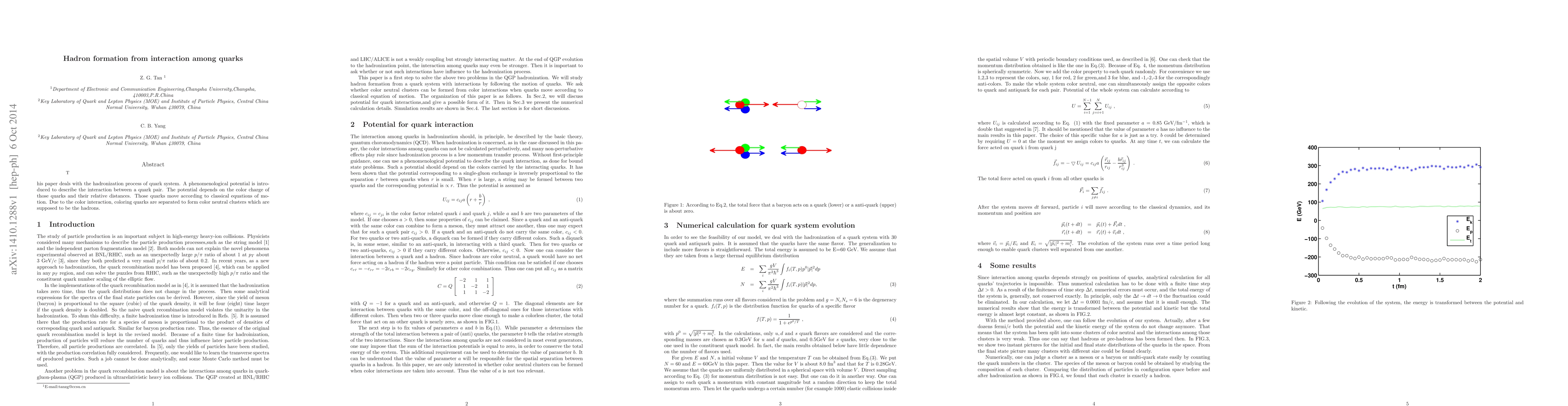 This paper deals with the hadronization process of quark system. A phenomenological potential is introduced to describe the interaction between a quark pair. The potential depends on the color charge of those quarks and their relative distances. Those quarks move according to classical equations of motion. Due to the color interaction, coloring quarks are separated to form color neutral clusters which are supposed to be the hadrons.