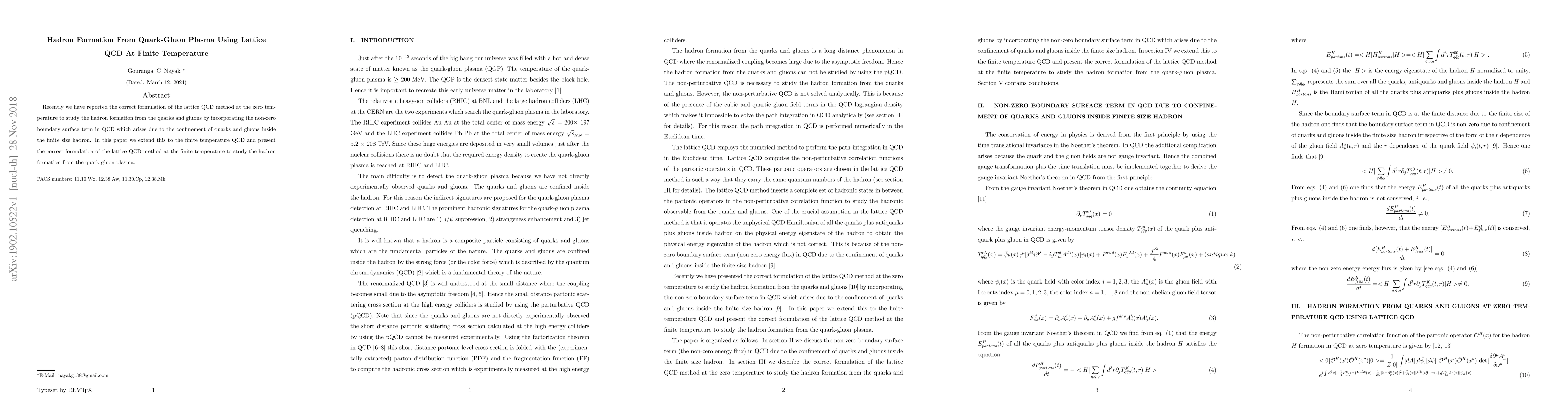 The paper presents a novel formulation of lattice QCD at finite temperature, incorporating a non-zero boundary surface term to study hadron formation from quark-gluon plasma, ensuring energy conservation in the process.