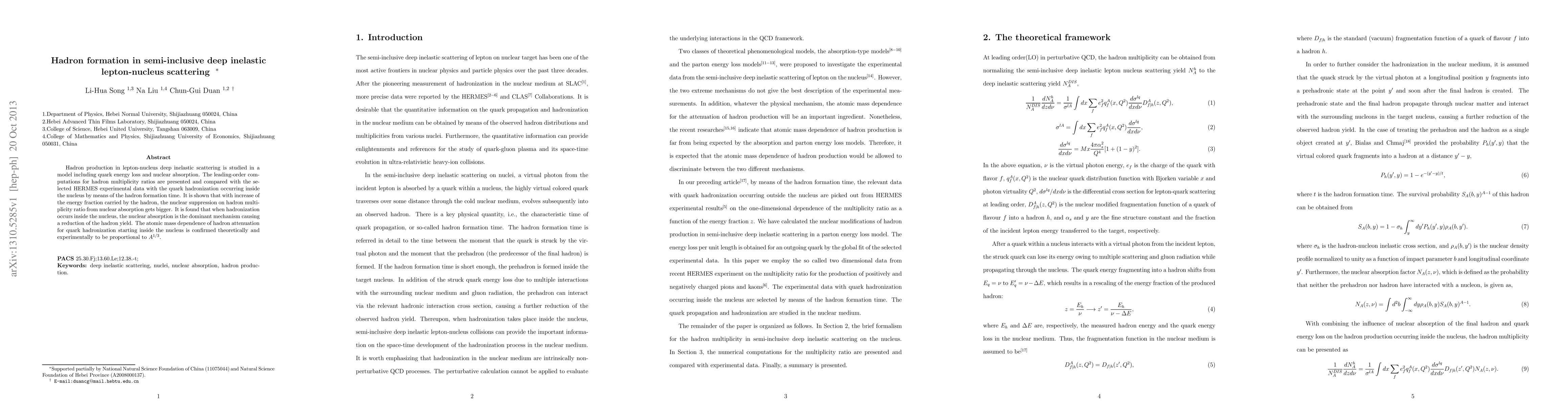 Hadron production in lepton-nucleus deep inelastic scattering is studied in a model including quark energy loss and nuclear absorption. The leading-order computations for hadron multiplicity ratios are presented and compared with the selected HERMES experimental data with the quark hadronization occurring inside the nucleus by means of the hadron formation time. It is shown that with increase of the energy fraction carried by the hadron, the nuclear suppression on hadron multiplicity ratio from nuclear absorption gets bigger. It is found that when hadronization occurs inside the nucleus, the nuclear absorption is the dominant mechanism causing a reduction of the hadron yield. The atomic mass dependence of hadron attenuation for quark hadronization starting inside the nucleus is confirmed theoretically and experimentally to be proportional to $ A^{1/3}$.
