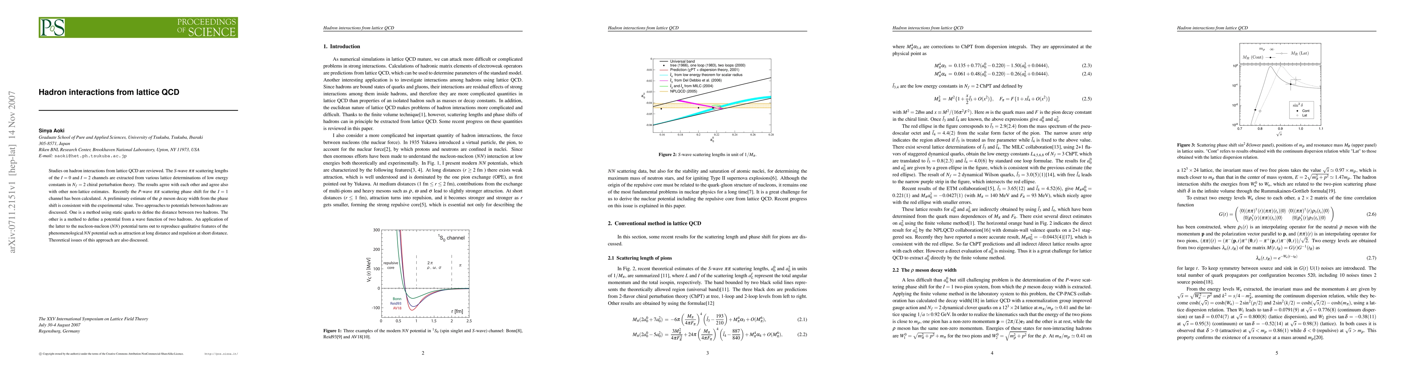 This paper reviews lattice QCD studies on hadron interactions, focusing on $S$-wave $\pi\pi$ scattering lengths and $P$-wave $\pi\pi$ scattering phase shifts. It finds agreement between lattice calculations and non-lattice estimates, and discusses two approaches to defining hadron interaction potentials, showing that one method can reproduce features of the nucleon-nucleon potential.