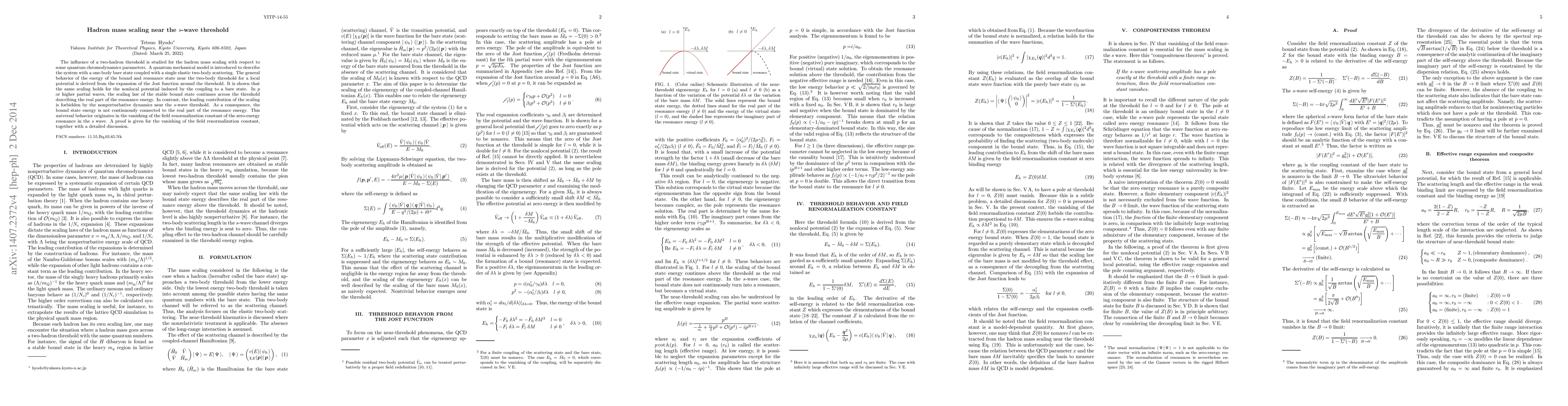 The influence of a two-hadron threshold is studied for the hadron mass scaling with respect to some quantum chromodynamics parameters. A quantum mechanical model is introduced to describe the system with a one-body bare state coupled with a single elastic two-body scattering. The general behavior of the energy of the bound and resonance state near the two-body threshold for a local potential is derived from the expansion of the Jost function around the threshold. It is shown that the same scaling holds for the nonlocal potential induced by the coupling to a bare state. In p or higher partial waves, the scaling law of the stable bound state continues across the threshold describing the real part of the resonance energy. In contrast, the leading contribution of the scaling is forbidden by the nonperturbative dynamics near the s-wave threshold. As a consequence, the bound state energy is not continuously connected to the real part of the resonance energy. This universal behavior originates in the vanishing of the field renormalization constant of the zero-energy resonance in the s wave. A proof is given for the vanishing of the field renormalization constant, together with a detailed discussion.