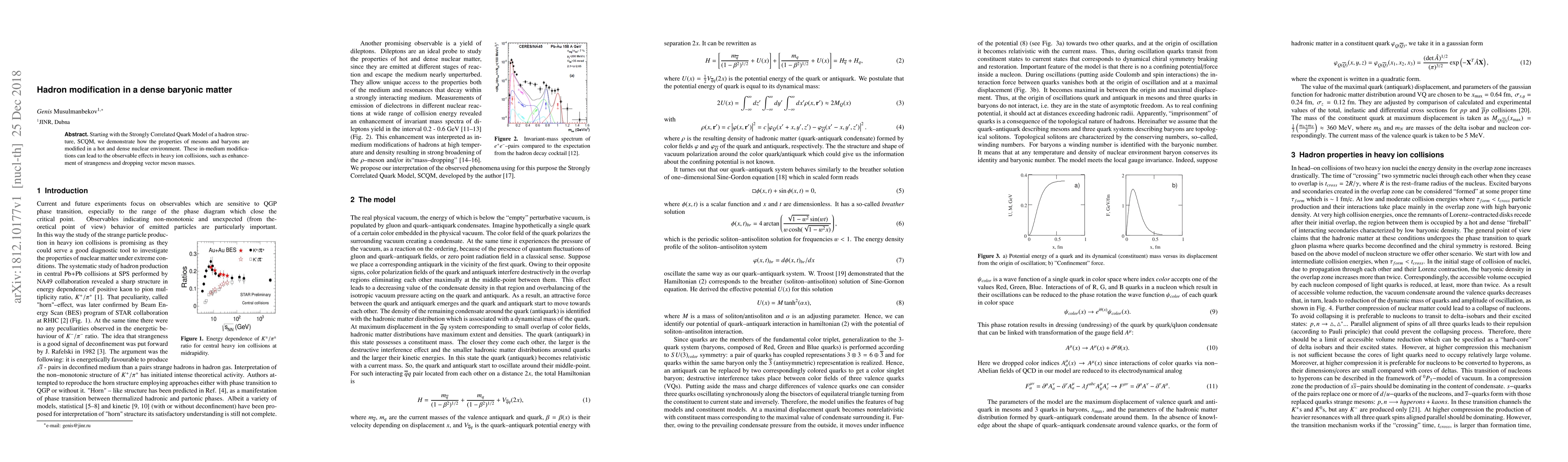 Starting with the Strongly Correlated Quark Model of a hadron structure, SCQM, we demonstrate how the properties of mesons and baryons are modified in a hot and dense nuclear environment. These in-medium modifications can lead to the observable effects in heavy ion collisions, such as enhancement of strangeness and dropping vector meson masses.