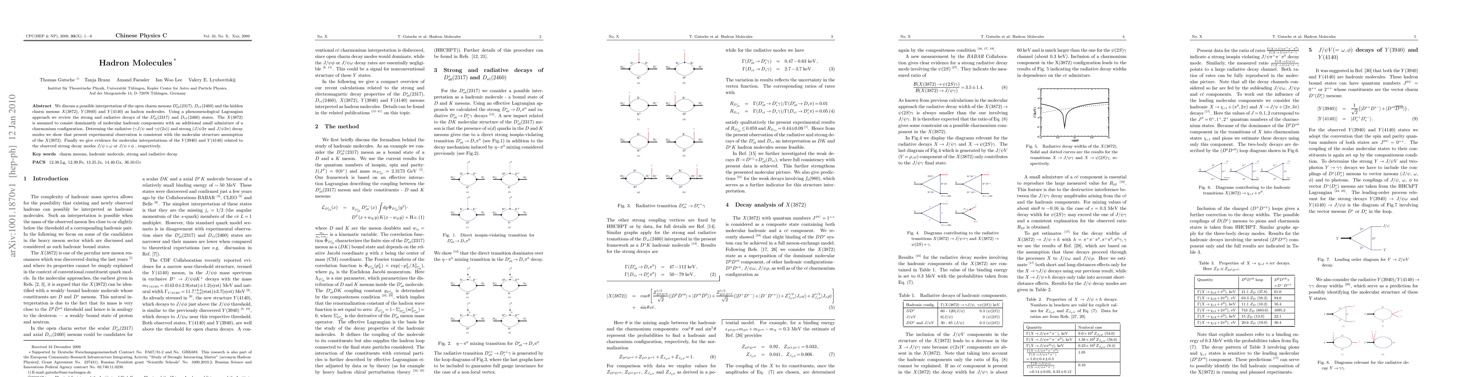 We discuss a possible interpretation of the open charm mesons $D_{s0}^*(2317)$, $D_{s1}(2460)$ and the hidden charm mesons X(3872), Y(3940) and Y(4140) as hadron molecules. Using a phenomenological Lagrangian approach we review the strong and radiative decays of the $D_{s0}^* (2317)$ and $D_{s1}(2460)$ states. The X(3872) is assumed to consist dominantly of molecular hadronic components with an additional small admixture of a charmonium configuration. Determing the radiative ($\gamma J/\psi$ and $\gamma \psi(2s)$) and strong ($J/\psi 2\pi $ and $ J/\psi 3\pi$) decay modes we show that present experimental observation is consistent with the molecular structure assumption of the X(3872). Finally we give evidence for molecular interpretations of the Y(3940) and Y(4140) related to the observed strong decay modes $J/\psi + \omega$ or $J/\psi + \phi$, respectively.