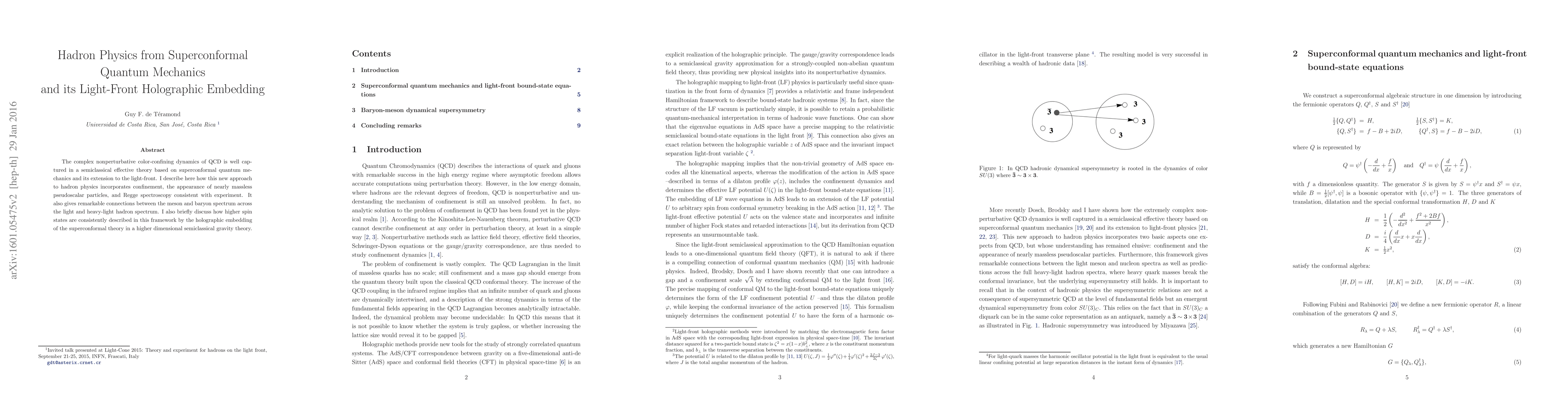 The complex nonperturbative color-confining dynamics of QCD is well captured in a semiclassical effective theory based on superconformal quantum mechanics and its extension to the light-front. I describe here how this new approach to hadron physics incorporates confinement, the appearance of nearly massless pseudoscalar particles, and Regge spectroscopy consistent with experiment. It also gives remarkable connections between the meson and baryon spectrum across the light and heavy-light hadron spectrum. I also briefly discuss how higher spin states are consistently described in this framework by the holographic embedding of the superconformal theory in a higher dimensional semiclassical gravity theory.