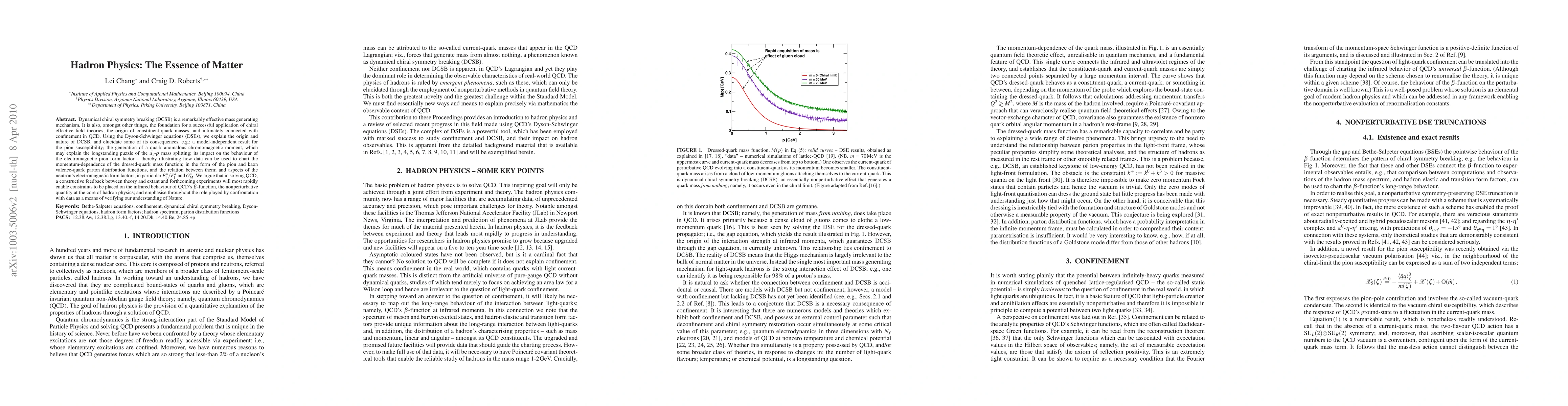 Dynamical chiral symmetry breaking (DCSB) is a remarkably effective mass generating mechanism. It is also, amongst other things, the foundation for a successful application of chiral effective field theories, the origin of constituent-quark masses, and intimately connected with confinement in QCD. Using the Dyson-Schwinger equations (DSEs), we explain the origin and nature of DCSB, and elucidate some of its consequences, e.g.: a model-independent result for the pion susceptibility; the generation of a quark anomalous chromomagnetic moment, which may explain the longstanding puzzle of the a_1-rho mass splitting; its impact on the behaviour of the electromagnetic pion form factor -- thereby illustrating how data can be used to chart the momentum-dependence of the dressed-quark mass function; in the form of the pion and kaon valence-quark parton distribution functions, and the relation between them; and aspects of the neutron's electromagnetic form factors, in particular F_1^u/F_1^d and G_M^n. We argue that in solving QCD, a constructive feedback between theory and extant and forthcoming experiments will most rapidly enable constraints to be placed on the infrared behaviour of QCD's \beta-function, the nonperturbative quantity at the core of hadron physics; and emphasise throughout the role played by confrontation with data as a means of verifying our understanding of Nature.