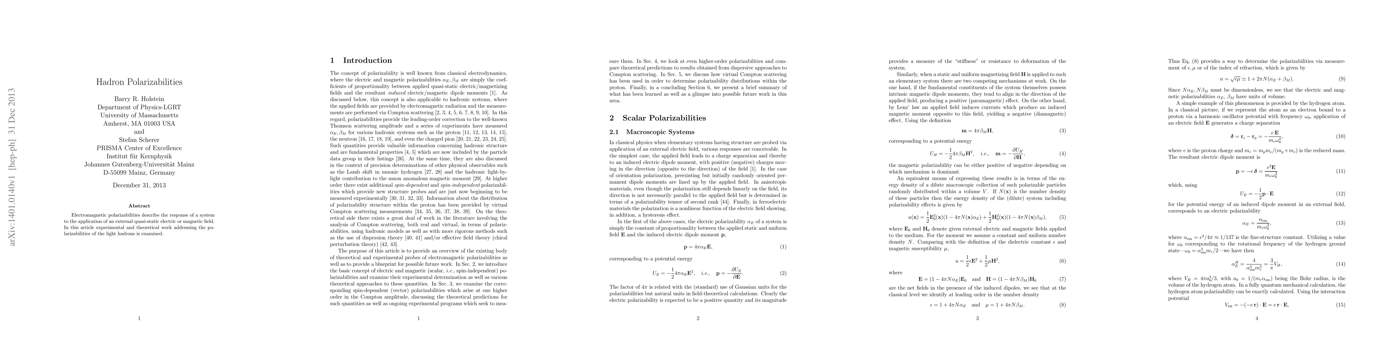 Electromagnetic polarizabilities describe the response of a system to the application of an external quasi-static electric or magnetic field. In this article experimental and theoretical work addressing the polarizabilities of the light hadrons is examined.